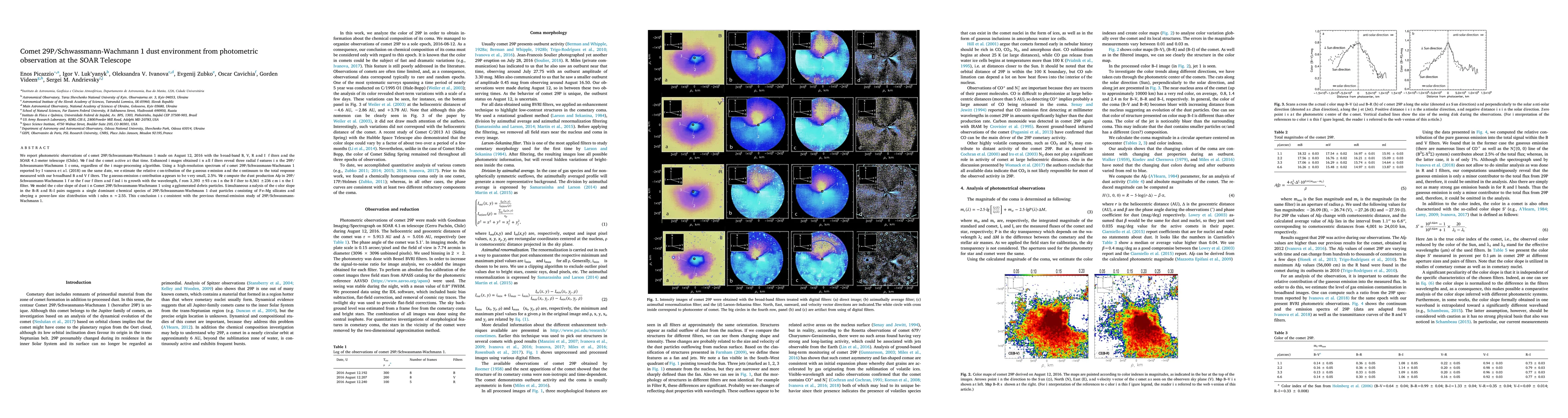 This study reports photometric observations of comet 29P/Schwassmann-Wachmann 1 using the SOAR Telescope, revealing three radial features in its coma and indicating active behavior. The dust production rate increases with wavelength, and the dust composition is modeled as Fe-Mg silicates with a power-law size distribution.