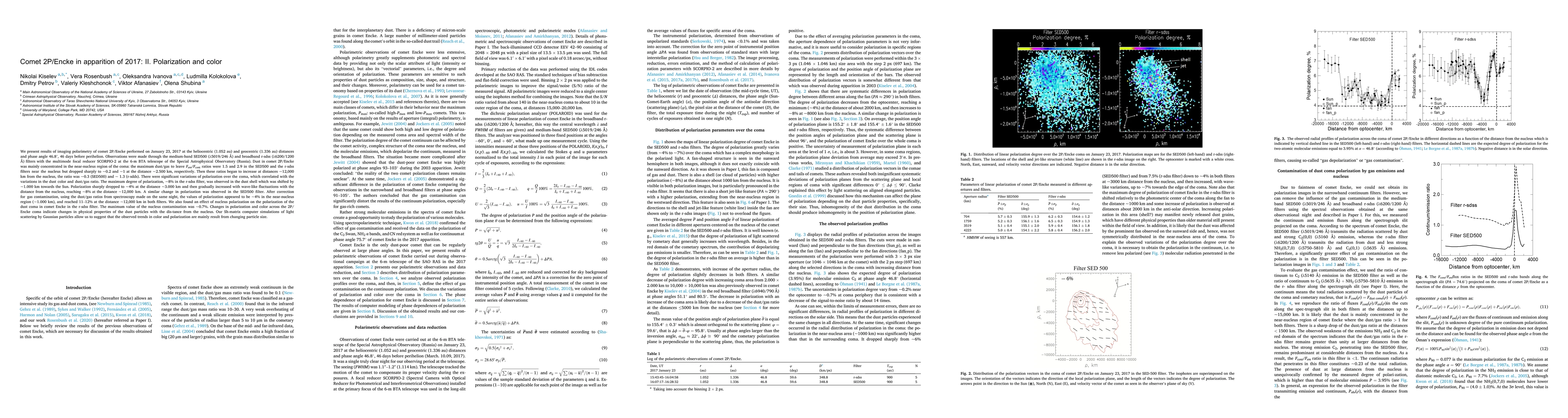 We present results of imaging polarimetry of comet 2P/Encke performed on January 23, 2017 at the heliocentric (1.052 au) and geocentric (1.336 au) distances and phase angle 46.8 deg, 46 days before perihelion. Observations were made through the medium-band SED500 ({\lambda}5019/246 {\AA}) and broadband r-sdss ({\lambda}6200/1200 {\AA}) filters with the multimode focal reducer SCORPIO-2 at the 6-m BTA telescope of the Special Astrophysical Observatory (Russia). Dust in comet 2P/Encke was mainly concentrated in the near-nucleus region of the coma: the maximum dust/gas ratios were 1.5 and 2.9 in the SED500 and the r-sdss filters near the nucleus but dropped sharply to ~0.2 and ~1 at the distance ~2500 km, respectively. Then these ratios began to increase at distances ~12000 km from the nucleus, the ratio was ~0.3 (SED500) and ~1.3 (r-sdds). There were significant variations of polarization over the coma, which correlated with the variations in the dust color and dust/gas ratio. Changes in polarization and color across the 2P/Encke coma indicate changes in physical properties of the dust particles with the distance from the nucleus. Our Sh-matrix computer simulations of light scattering by Gaussian particles allow us to suggest that the observed trends in color and polarization are mainly result from changing particle size.