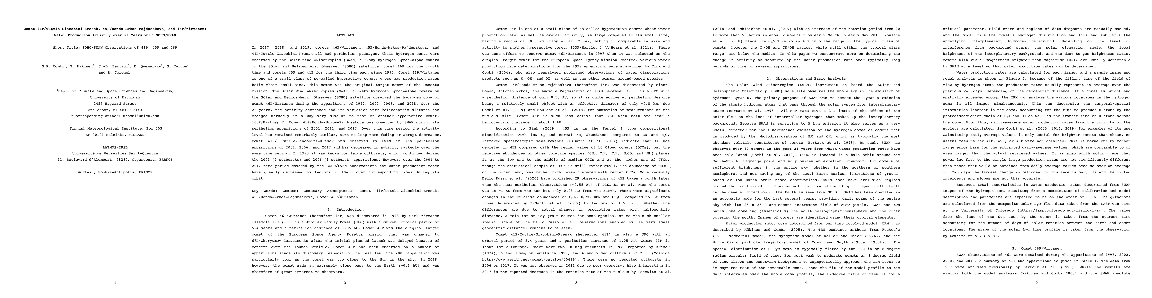 In 2017, 2018 and 2019, comets 46P/Wirtanen, 45P/Honda-Mrkos-Pajdusakova, and 41P/Tuttle-Giacobini-Kresak all had perihelion passages. Their hydrogen comae were observed by the Solar Wind ANisotropies (SWAN) all-sky hydrogen Lyman-alpha Camera on the SOlar and Heliospheric Observer (SOHO) satellite: comet 46P for the fourth time and comets 45P and 41P for the third time each since 1997. Comet 46P/Wirtanen is one of a small class of so-called hyperactive comets whose gas production rates belie their small size. This comet was the original target comet of the Rosetta mission. The Solar Wind ANisotropies (SWAN) all-sky hydrogen Lyman-alpha camera on the SOlar and Heliospheric Observer (SOHO) satellite observed the hydrogen coma of comet 46P/Wirtanen during the apparitions of 1997, 2002, 2008 and 2018. Over the 22 years, the activity decreased and its variation with heliocentric distance has changed markedly in a way very similar to that of another hyperactive comet, 103P/Hartley 2. Comet 45P/Honda-Mrkos-Pajdusakova was observed by SWAN during its perihelion apparitions of 2001, 2011 and 2017. Over this time period the activity level has remained remarkably similar, with no long-term fading or abrupt decreases. Comet 41P/Tuttle-Giacobini-Kresak was observed by SWAN in its perihelion apparitions of 2001, 2006 and 2017 and has decreased in activity markedly over the same time period. In 1973 it was known for large outbursts, which continued during the 2001 (2 outbursts) and 2006 (1 outburst) apparitions. However, over the 2001 to 2017 time period covered by the SOHO/SWAN observations the water production rates have greatly decreased by factors of 10-30 over corresponding times during its orbit.