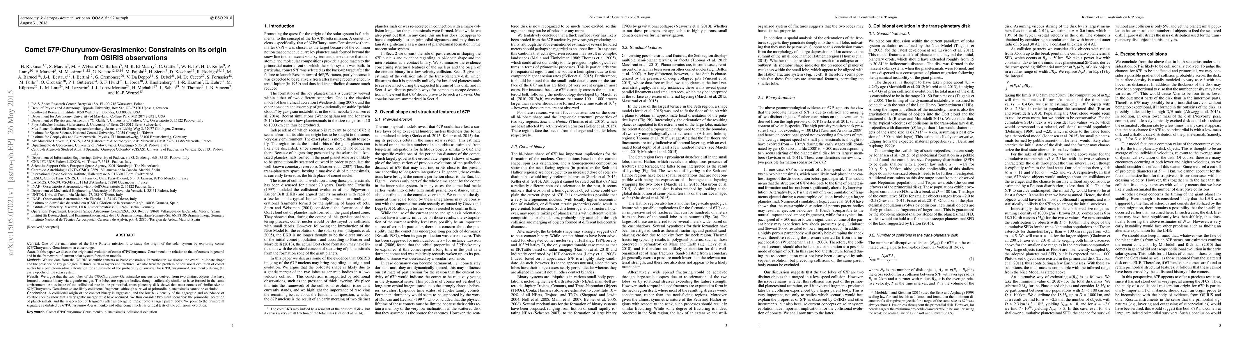 This paper uses OSIRIS observations from the Rosetta mission to explore the origin and evolution of comet 67P/Churyumov-Gerasimenko, suggesting it formed as a contact binary from two distinct objects through a gentle merger. The study also discusses the likelihood of its survival and formation in the primordial solar system, proposing a collisional origin and highlighting primordial signatures as evidence.