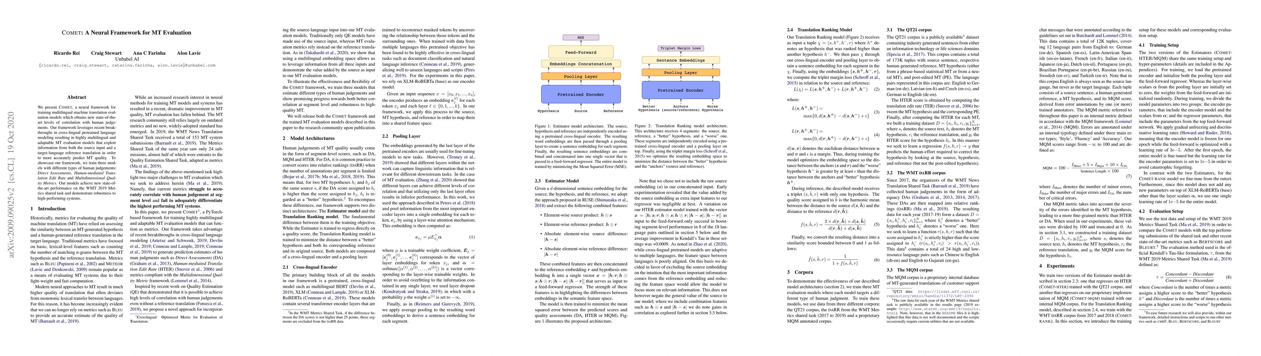 COMET is a neural framework that trains multilingual machine translation evaluation models to achieve state-of-the-art correlation with human judgments, outperforming existing systems on metrics such as WMT 2019.