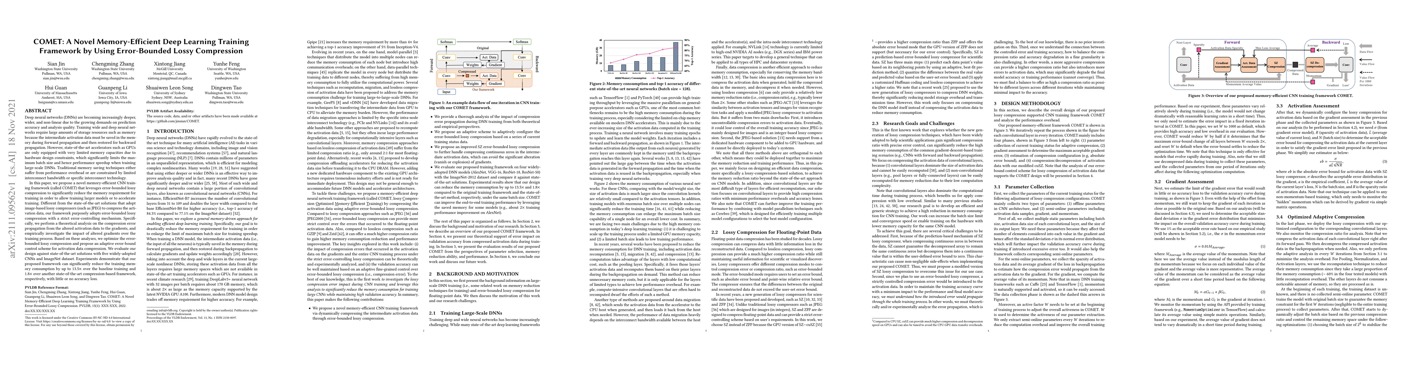 Title: COMET: A Novel Memory-Efficient Deep Learning Training Framework by Using Error-Bounded Lossy Compression Summary: The paper introduces COMET, a memory-efficient deep learning training framework using error-bounded lossy compression to reduce memory requirements during training, achieving up to 13.5X reduction compared to baseline methods with minimal loss in accuracy.