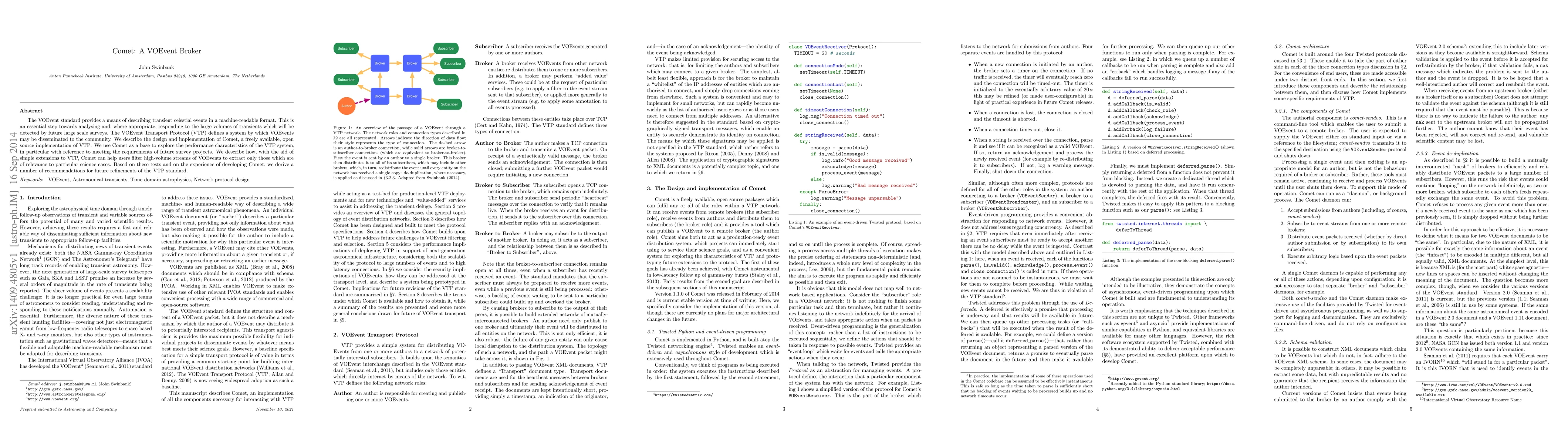 The paper describes the design and implementation of Comet, an open-source VOEvent Broker adhering to the VOEvent Transport Protocol (VTP). It explores Comet's performance and proposes enhancements to the VTP standard to better meet future survey project requirements.