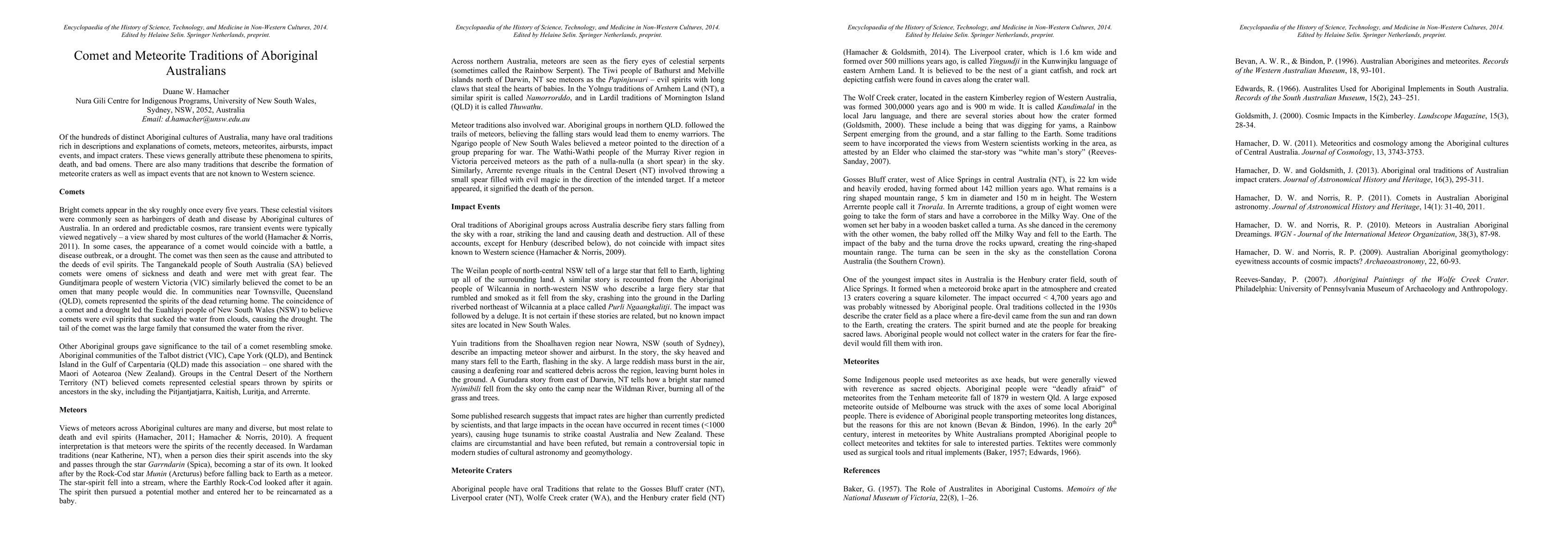 Summary: Aboriginal Australian cultures possess rich oral traditions detailing comets, meteors, and impact events, often attributing these phenomena to spiritual significance and bad omens, including accounts of craters and impact events not recognized by Western science.