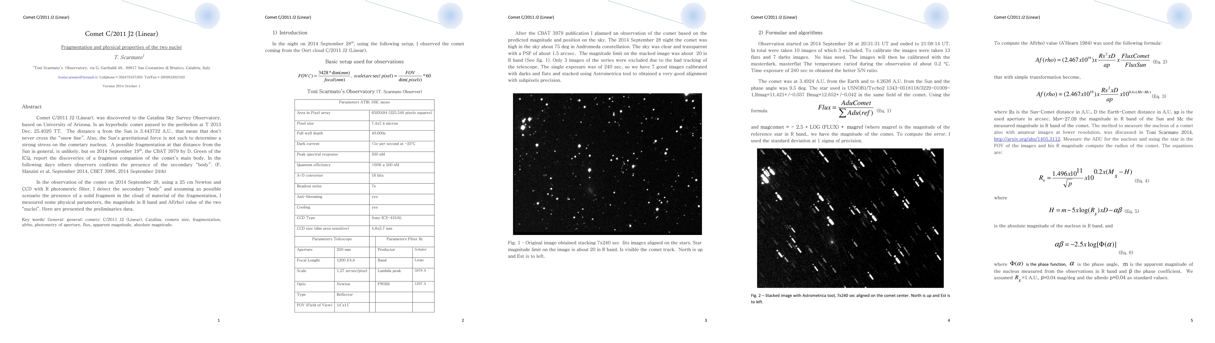 Researchers discovered a fragment companion to comet C/2011 J2 (Linear) and measured its physical properties, including magnitude and density parameters, using observations with a 25 cm telescope.