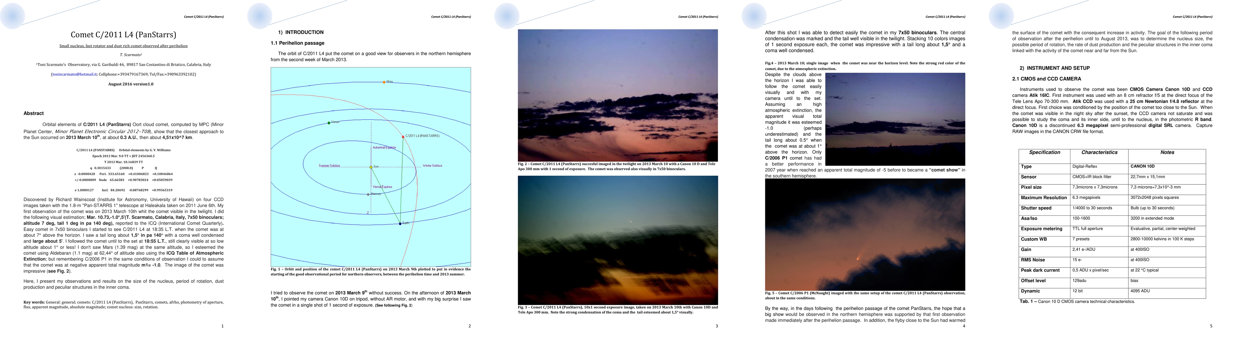 This paper reports on observations of the comet C/2011 L4 (PanStarrs), noting its small nucleus, rapid rotation, and high dust production after perihelion. The author provides visual estimates of the comet's brightness and tail during its close approach to the Sun in March 2013.