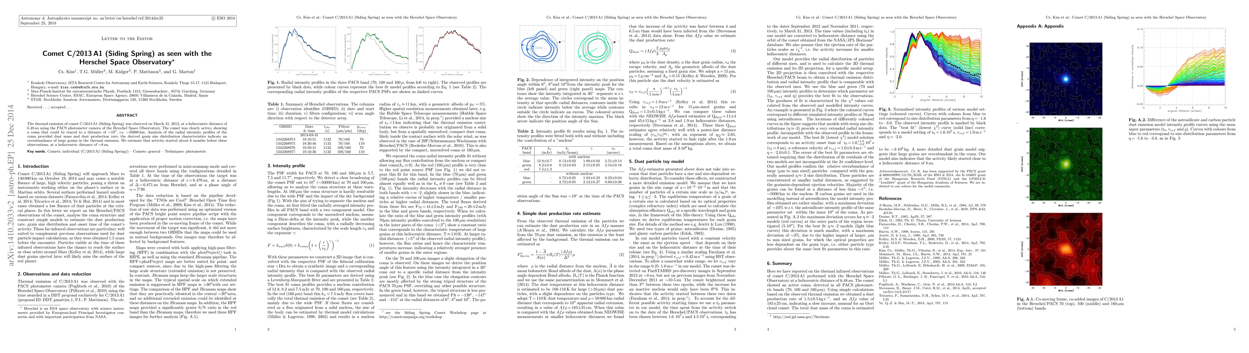 The thermal emission of comet C/2013 A1 (Siding Spring) was observed on March 31, 2013, at a heliocentric distance of 6.48 au using the PACS photometer camera of the Herschel Space Observatory. The comet was clearly active, showing a coma that could be traced to a distance of 10", i.e. 50000 km. Analysis of the radial intensity profiles of the coma provided dust mass and dust production rate; the derived grain size distribution characteristics indicate an overabundance of large grains in the thermal emission. We estimate that activity started about 6 months before these observations, at a heliocentric distance of 8 au.