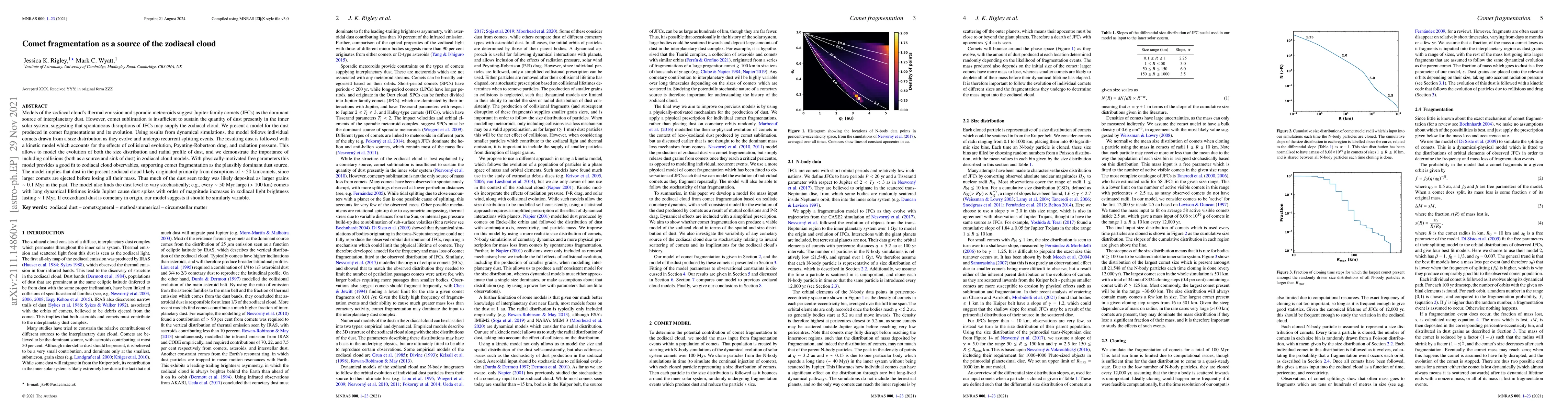 This paper proposes that comet fragmentation, rather than sublimation, is the primary source of the zodiacal cloud, driven by recurrent splitting events of Jupiter-family comets. The model incorporates collisional evolution, Poynting-Robertson drag, and radiation pressure to simulate dust evolution, showing that dust spikes from large cometary disruptions can significantly affect the cloud's brightness.