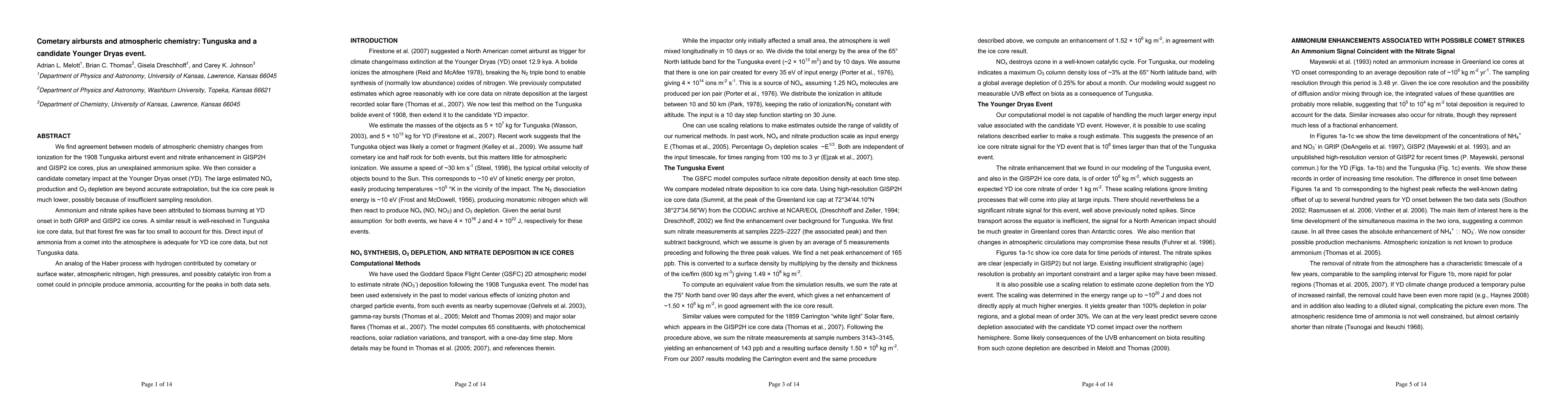 We find agreement between models of atmospheric chemistry changes from ionization for the 1908 Tunguska airburst event and nitrate enhancement in GISP2H and GISP2 ice cores, plus an unexplained ammonium spike. We then consider a candidate cometary impact at the Younger Dryas onset (YD). The large estimated NO_x production and O_3 depletion are beyond accurate extrapolation, but the ice core peak is much lower, possibly because of insufficient sampling resolution. Ammonium and nitrate spikes have been attributed to biomass burning at YD onset in both GRIP and GISP2 ice cores. A similar result is well-resolved in Tunguska ice core data, but that forest fire was far too small to account for this. Direct input of ammonia from a comet into the atmosphere is adequate for YD ice core data, but not Tunguska data. An analog of the Haber process with hydrogen contributed by cometary or surface water, atmospheric nitrogen, high pressures, and possibly catalytic iron from a comet could in principle produce ammonia, accounting for the peaks in both data sets.