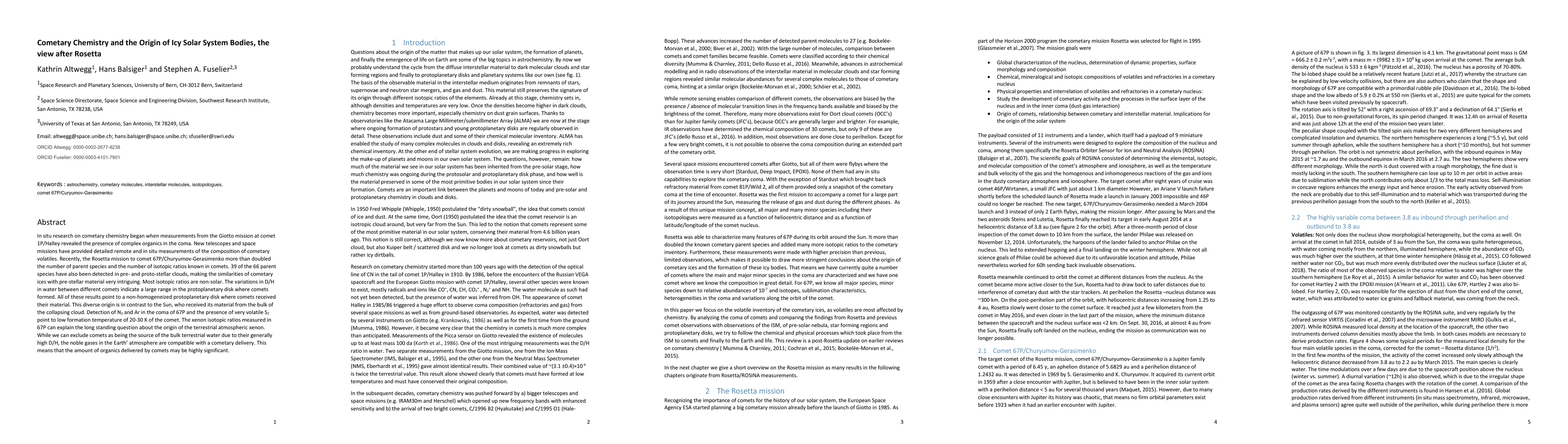 The Rosetta mission significantly advanced our understanding of cometary chemistry, revealing complex organics and non-solar isotopic ratios in comet 67P/Churyumov-Gerasimenko. These findings suggest a diverse, non-homogeneized protoplanetary disk and indicate that comets may have delivered significant amounts of organics and noble gases to Earth, though not the bulk of terrestrial water.