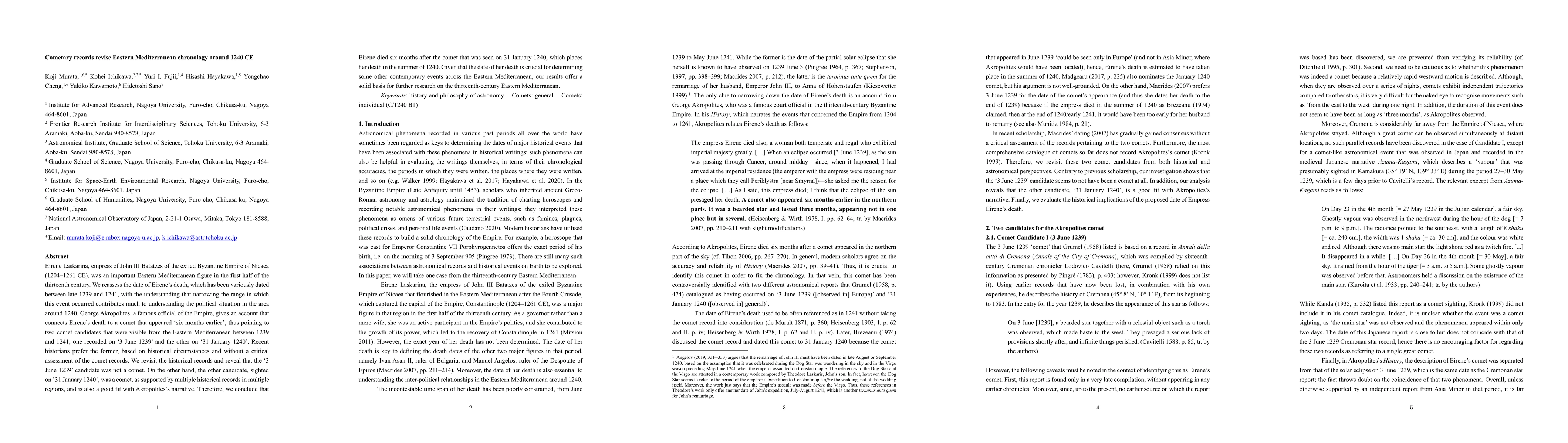 Eirene Laskarina, empress of John III Batatzes of the exiled Byzantine Empire of Nicaea (1204--1261 CE), was an important Eastern Mediterranean figure in the first half of the thirteenth century. We reassess the date of Eirene's death, which has been variously dated between late 1239 and 1241, with the understanding that narrowing the range in which this event occurred contributes much to understanding the political situation in the area around 1240. George Akropolites, a famous official of the Empire, gives an account that connects Eirene's death to a comet that appeared "six months earlier", thus pointing to two comet candidates that were visible from the Eastern Mediterranean between 1239 and 1241, one recorded on "3 June 1239" and the other on "31 January 1240". Recent historians prefer the former, based on historical circumstances and without a critical assessment of the comet records. We revisit the historical records and reveal that the "3 June 1239" candidate was not a comet. On the other hand, the other candidate, sighted on "31 January 1240", was a comet, as supported by multiple historical records in multiple regions, and is also a good fit with Akropolites's narrative. Therefore, we conclude that Eirene died six months after the comet that was seen on 31 January 1240, which places her death in the summer of 1240. Given that the date of her death is crucial for determining some other contemporary events across the Eastern Mediterranean, our results offer a solid basis for further research on the thirteenth-century Eastern Mediterranean.