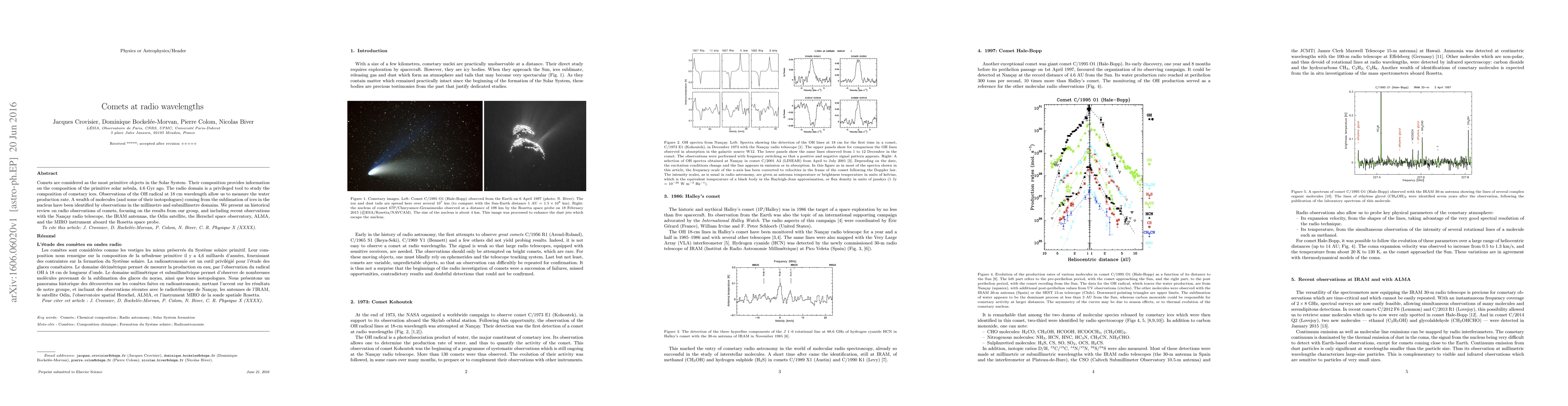 This paper provides a historical review of radio observations of comets, emphasizing the use of radio wavelengths to study cometary ices and their composition, which offers insights into the primitive solar nebula. Recent findings from various instruments, including the Nan\c{c}ay telescope and the Rosetta probe, are highlighted.
