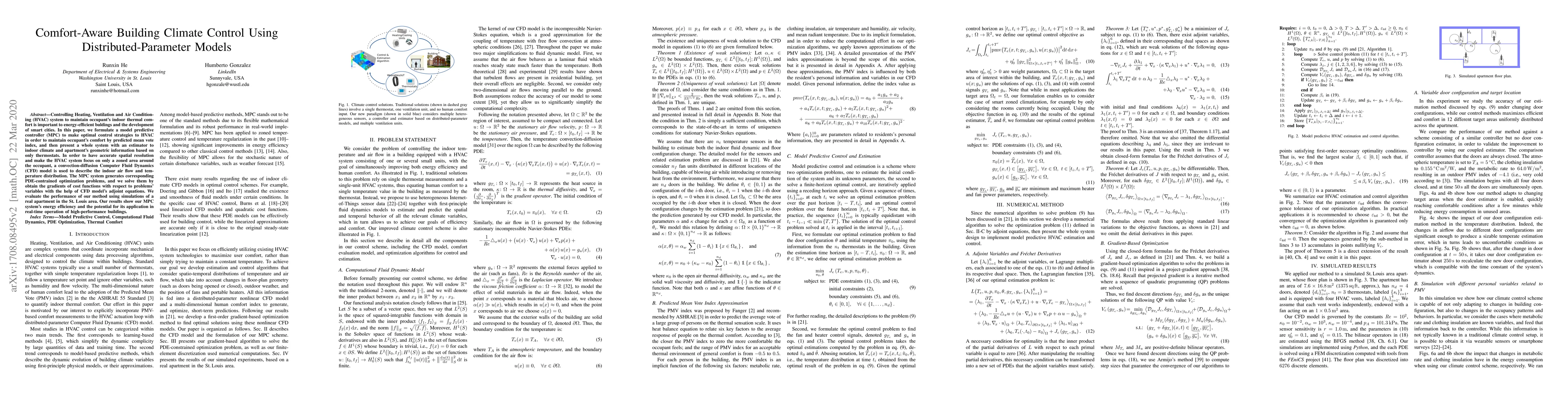 Controlling Heating, Ventilation and Air Conditioning (HVAC) system to maintain occupant's indoor thermal comfort is important to energy-efficient buildings and the development of smart cities. In this paper, we formulate a model predictive controller (MPC) to make optimal control strategies to HVAC in order to maintain occupant's comfort by predicted mean vote index, and then present a whole system with an estimator to indoor climate and apartment's geometric information based on only thermostats. In order to have accurate spatial resolution and make the HVAC system focus on only a zoned area around the occupant, a convection-diffusion Computer Fluid Dynamics (CFD) model is used to describe the indoor air flow and temperature distribution. The MPC system generates corresponding PDE-constrained optimization problems, and we solve them by obtain the gradients of cost functions with respect to problems' variables with the help of CFD model's adjoint equations. We evaluate the performance of our method using simulations of a real apartment in the St.\ Louis area. Our results show our MPC system's energy efficiency and the potential for its application in real-time operation of high-performance buildings.