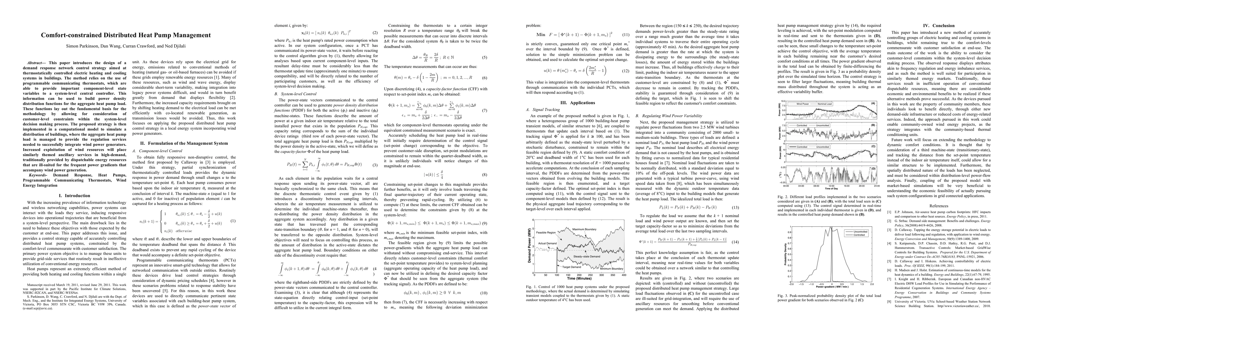 This paper introduces the design of a demand response network control strategy aimed at thermostatically controlled electric heating and cooling systems in buildings. The method relies on the use of programmable communicating thermostats, which are able to provide important component-level state variables to a system-level central controller. This information can be used to build power density distribution functions for the aggregate heat pump load. These functions lay out the fundamental basis for the methodology by allowing for consideration of customer-level constraints within the system-level decision making process. The proposed strategy is then implemented in a computational model to simulate a distribution of buildings, where the aggregate heat pump load is managed to provide the regulation services needed to successfully integrate wind power generators. Increased exploitation of wind resources will place similarly themed ancillary services in high-demand, traditionally provided by dispatchable energy resources that are ill-suited for the frequent power gradients that accompany wind power generation.
