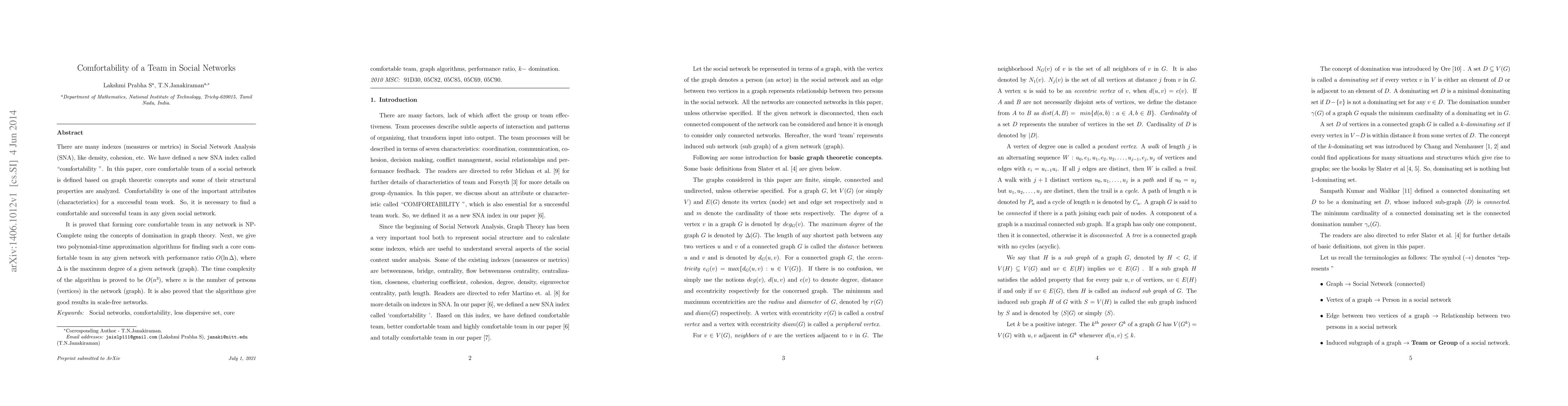 This paper introduces a new Social Network Analysis index called "comfortability" to measure team success in social networks. It defines a core comfortable team based on graph theory and presents two polynomial-time approximation algorithms for finding such teams, with a performance ratio of O(ln Δ) and a time complexity of O(n³).