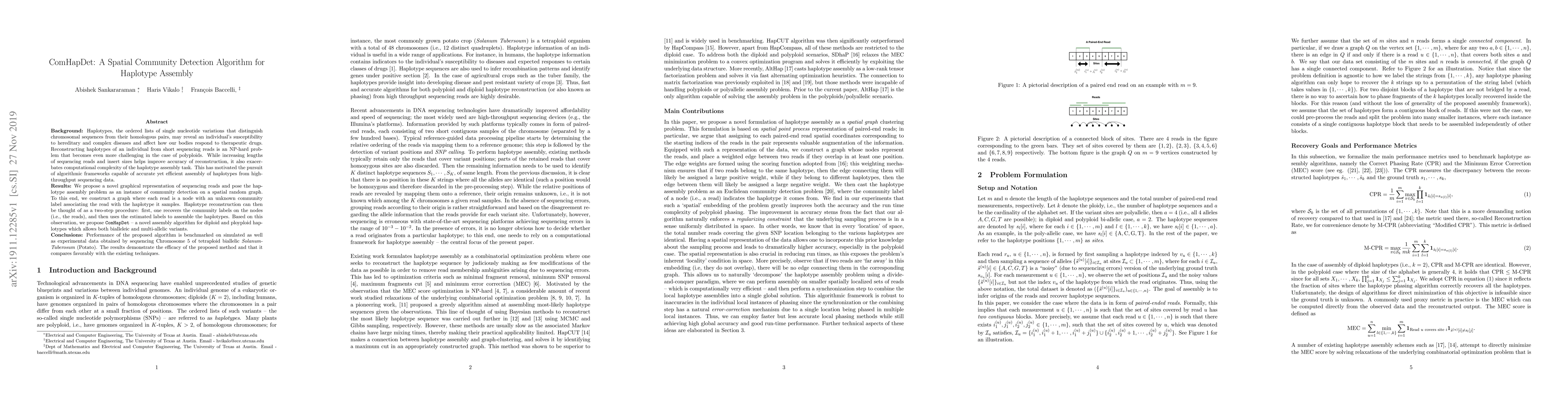The paper introduces ComHapDet, a spatial community detection algorithm for efficient haplotype assembly from high-throughput sequencing data, transforming the problem into a community detection task on a spatial random graph. The algorithm shows promising results in reconstructing haplotypes for both diploid and polyploid organisms, outperforming existing techniques.