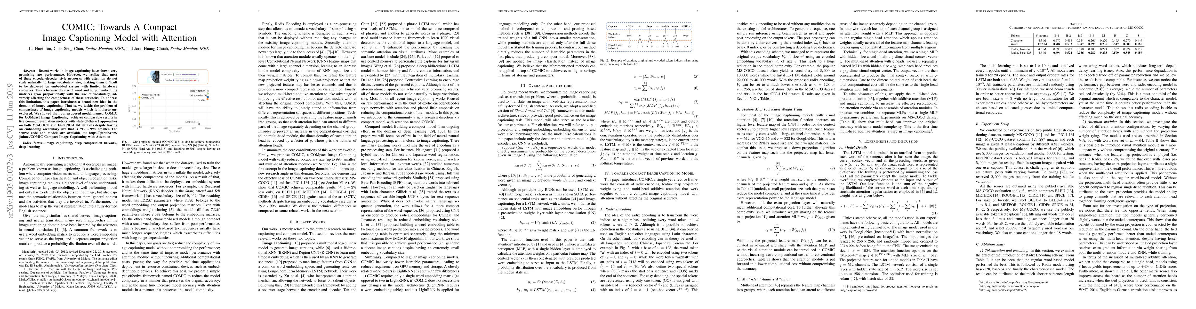 This paper introduces COMIC, a compact image captioning model with attention, designed to address the scalability issues of traditional encoder-decoder networks. The proposed model achieves comparable performance to state-of-the-art methods while using a significantly smaller vocabulary, making it suitable for deployment on resource-constrained embedded systems.