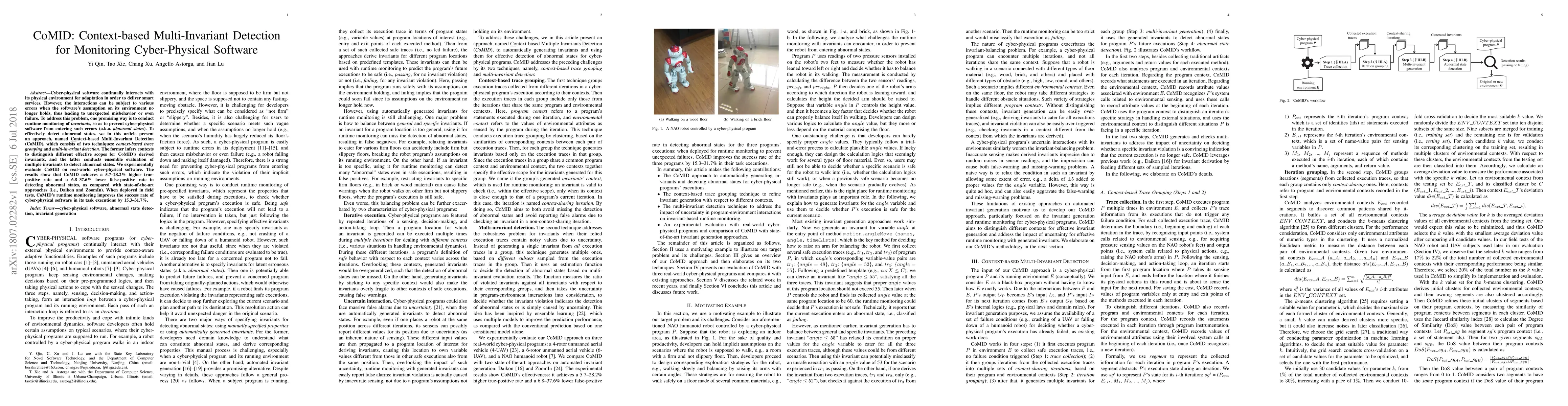 CoMID is a runtime monitoring approach for detecting abnormal states in cyber-physical software through context-based trace grouping and multi-invariant detection, achieving higher true-positive rates and lower false-positive rates compared to existing methods. Field tests show a significant improvement in software task success rates.