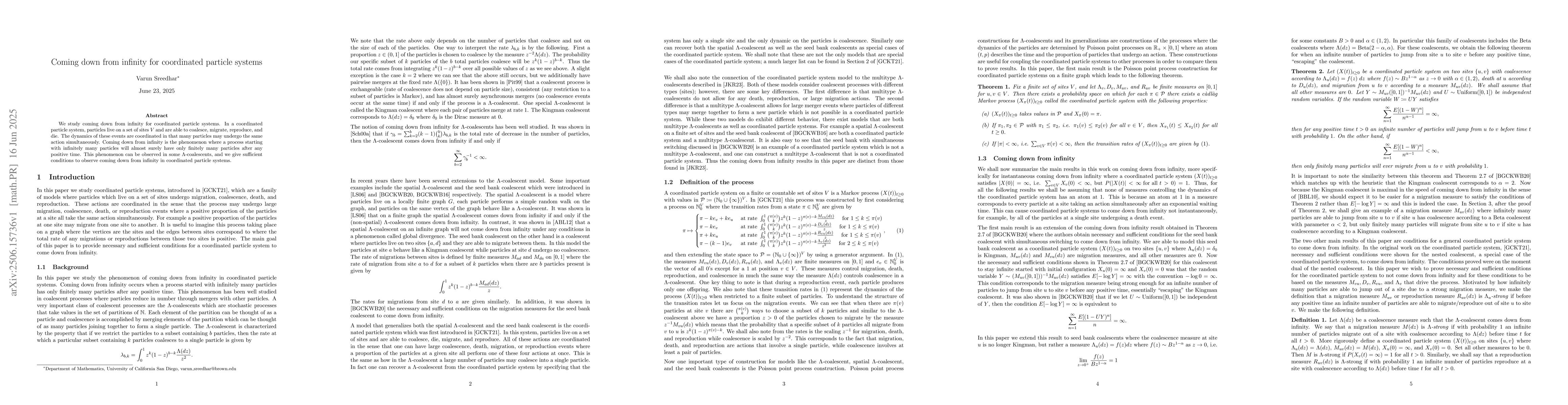We study coming down from infinity for coordinated particle systems. In a coordinated particle system, particles live on a set of sites $V$ and are able to coalesce, migrate, reproduce, and die. The dynamics of these events are coordinated in that many particles may undergo the same action simultaneously. Coming down from infinity is the phenomenon where a process starting with infinitely many particles will almost surely have only finitely many particles after any positive time. This phenomenon can be observed in some $\Lambda$-coalescents, and we give necessary and sufficient conditions to observe coming down from infinity in coordinated particle systems.