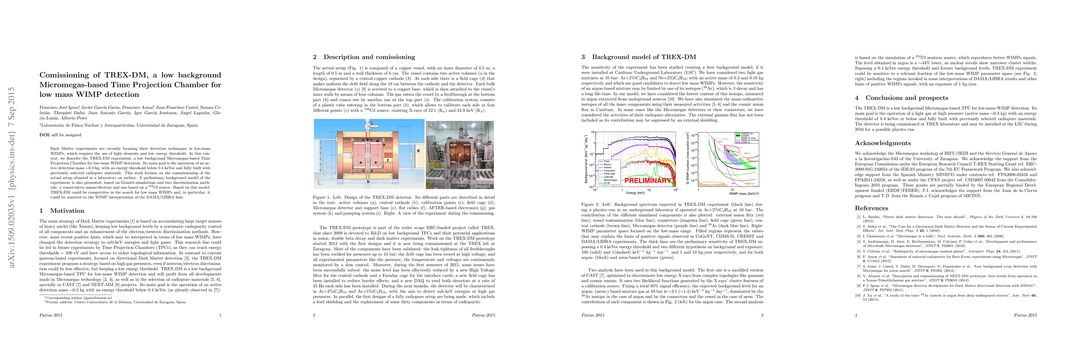 Dark Matter experiments are recently focusing their detection techniques in low-mass WIMPs, which requires the use of light elements and low energy threshold. In this context, we describe the TREX-DM experiment, a low background Micromegas-based Time Projection Chamber for low-mass WIMP detection. Its main goal is the operation of an active detection mass $\sim$0.3 kg, with an energy threshold below 0.4~keVee and fully built with previously selected radiopure materials. This work focuses on the commissioning of the actual setup situated in a laboratory on surface. A preliminary background model of the experiment is also presented, based on Geant4 simulations and two discrimination methods: a conservative muon/electron and one based on a $^{252}$Cf source. Based on this model, TREX-DM could be competitive in the search for low mass WIMPs and, in particular, it could be sensitive to the WIMP interpretation of the DAMA/LIBRA hint.