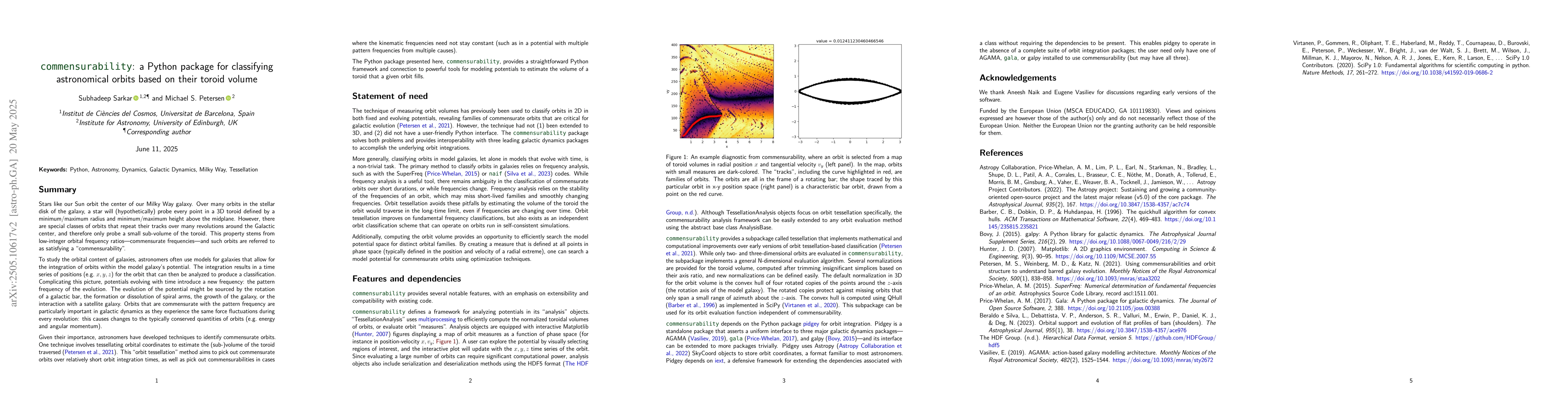 A new Python package called commensurability analyzes astronomical orbits by measuring the volume of a 3D toroid they traverse. It provides a robust method for classifying orbital families with commensurate frequencies.