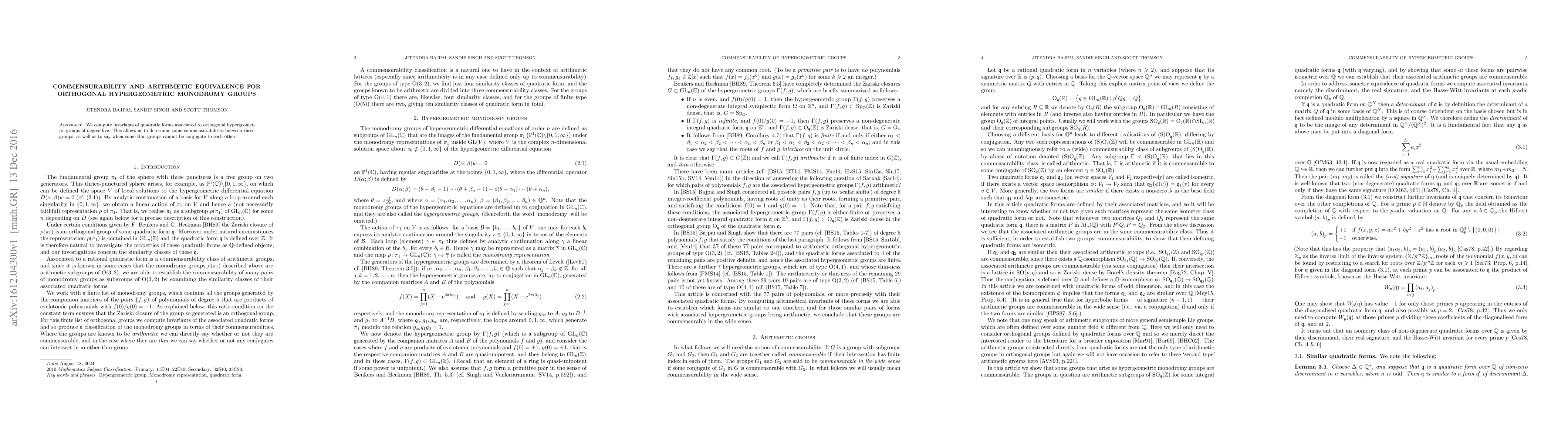 Researchers computed invariants of quadratic forms for orthogonal hypergeometric groups of degree five, determining commensurabilities between these groups and identifying non-conjugate thin groups.