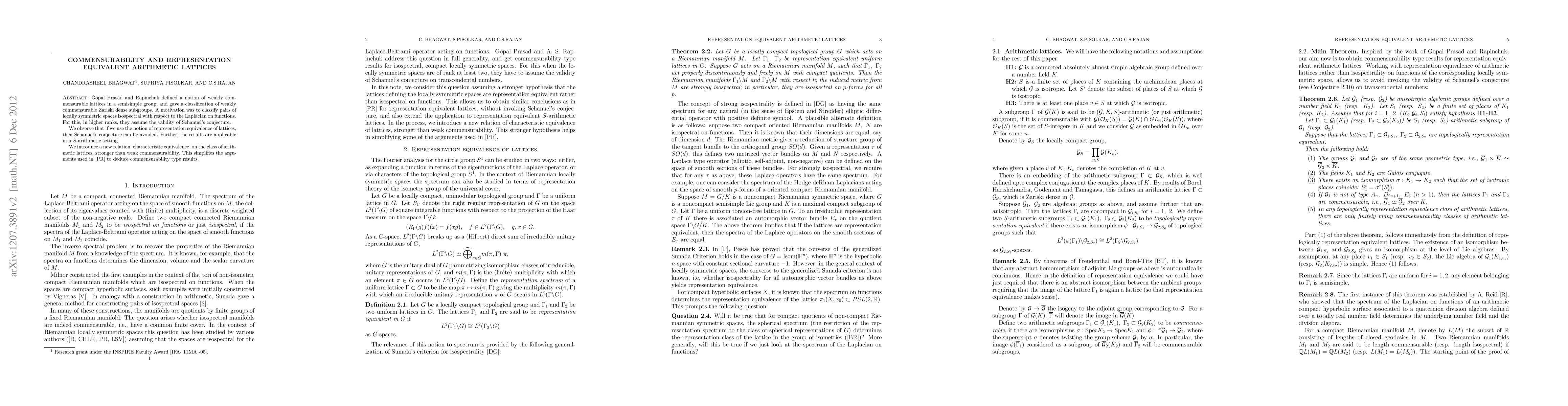 Gopal Prasad and A. S. Rapinchuk defined a notion of weakly commensurable lattices in a semisimple group, and gave a classification of weakly commensurable Zariski dense subgroups. A motivation was to classify pairs of locally symmetric spaces isospectral with respect to the Laplacian on functions. For this, in higher ranks, they assume the validity of Schanuel's conjecture. In this note, we observe that if we use the stronger notion of representation equivalence of lattices, then Schanuel's conjecture can be avoided. Further, the results are also applicable in a $S$-arithmetic setting. We also introduce a new relation on the class of arithmetic lattices, stronger than weak commensurability, which we call as characteristic equivalence, and show that it simplifies some of the arguments used in Prasad and Rapinchuk (2009) to deduce commensurability type results from weak commensurability.