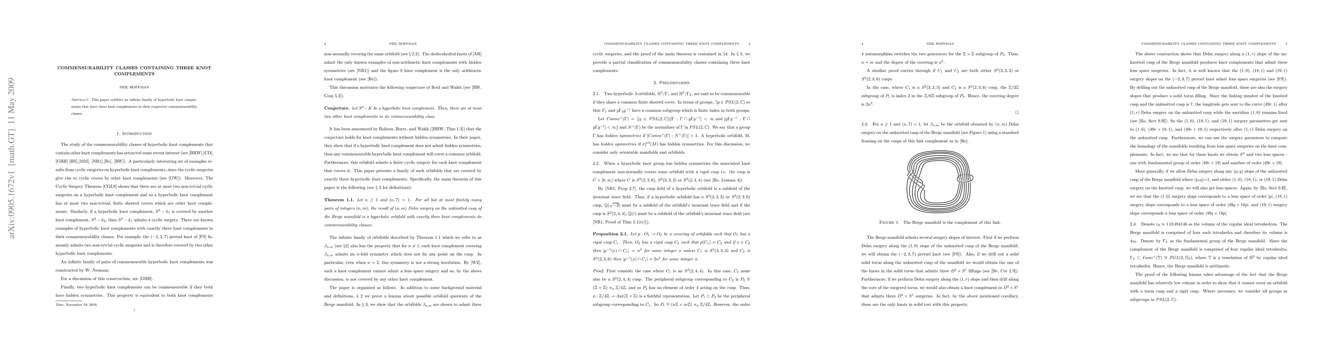 This paper identifies an infinite family of hyperbolic knot complements, demonstrating that each has exactly three distinct knot complements within its commensurability class. The findings highlight the intricate structure of commensurability classes in hyperbolic geometry.