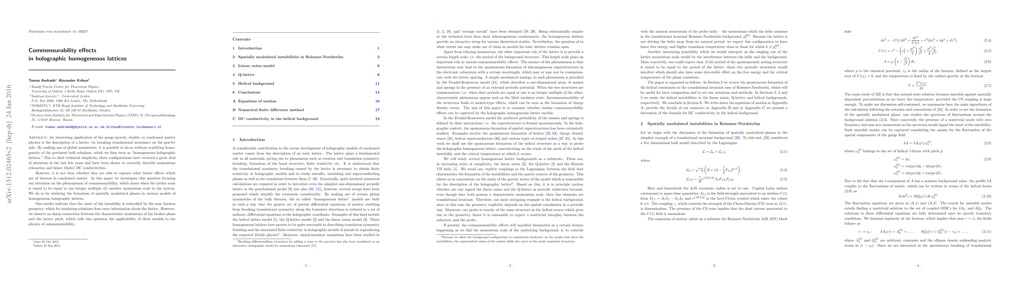 Researchers studied homogeneous holographic lattices to understand commensurability effects in condensed matter physics, finding that near-horizon geometry controls the onset of instability but not the connection between lattice pitch and broken phase momentum.