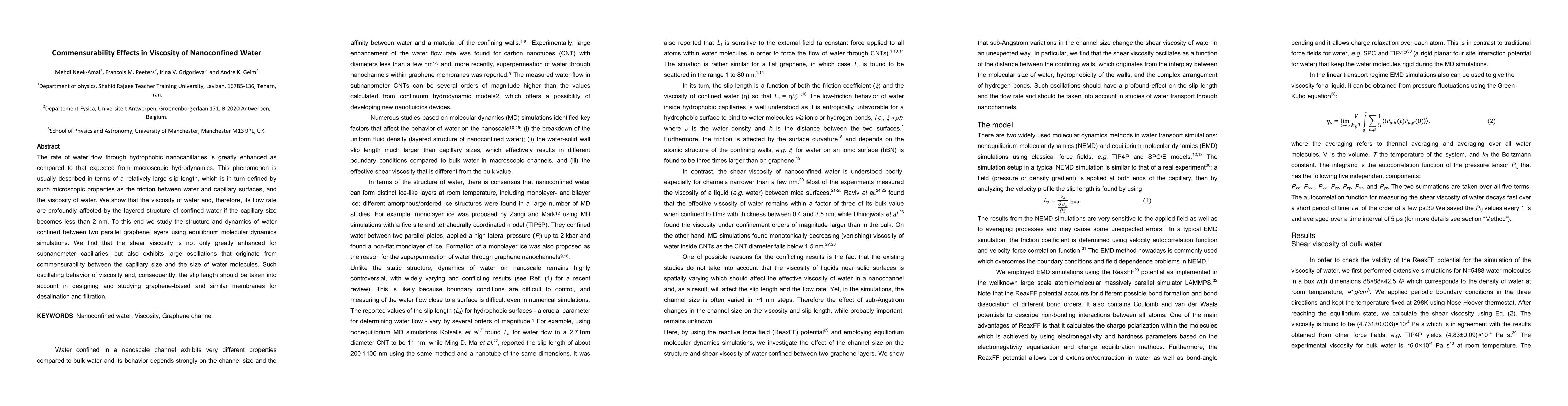 This paper investigates the viscosity of nanoconfined water in hydrophobic nanocapillaries, revealing that the viscosity and flow rate are significantly influenced by the capillary size when it drops below 2 nm. The study finds that the viscosity exhibits large oscillations due to commensurability effects, which should be considered in the design of graphene-based filtration systems.