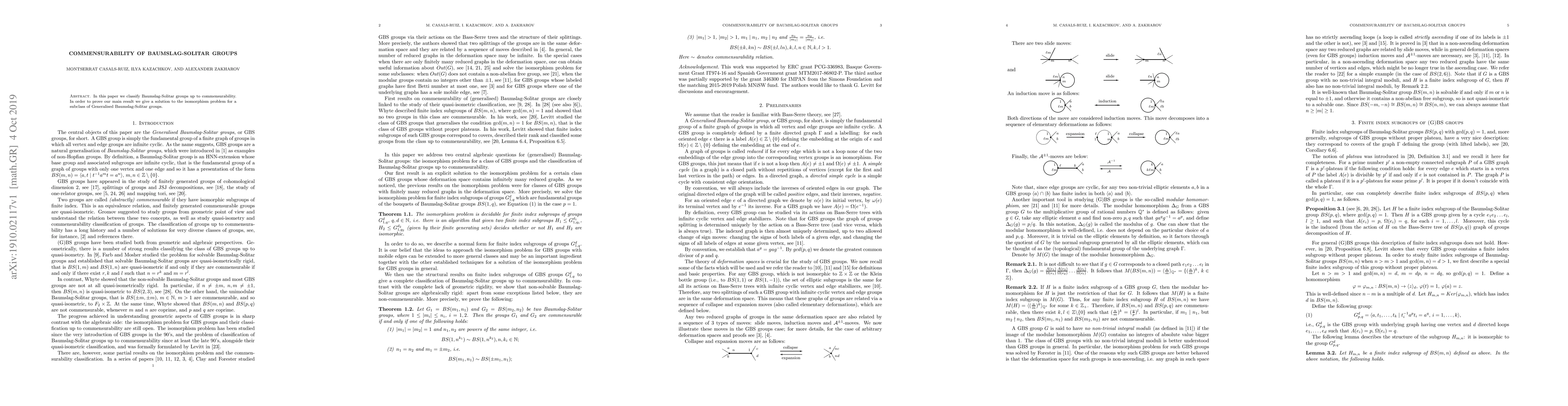 The paper presents a detailed analysis and classification of Baumslag-Solitar groups up to commensurability, along with a solution to the isomorphism problem for a specific subclass.