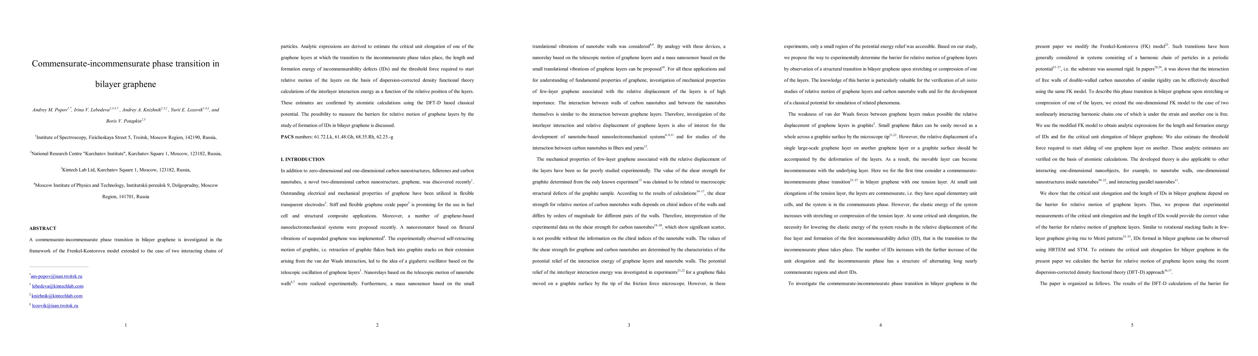 This paper investigates the commensurate-incommensurate phase transition in bilayer graphene using the Frenkel-Kontorova model, deriving critical parameters and confirming them via DFT-D calculations. It discusses the potential to measure relative motion barriers through incommensurability defect formation.