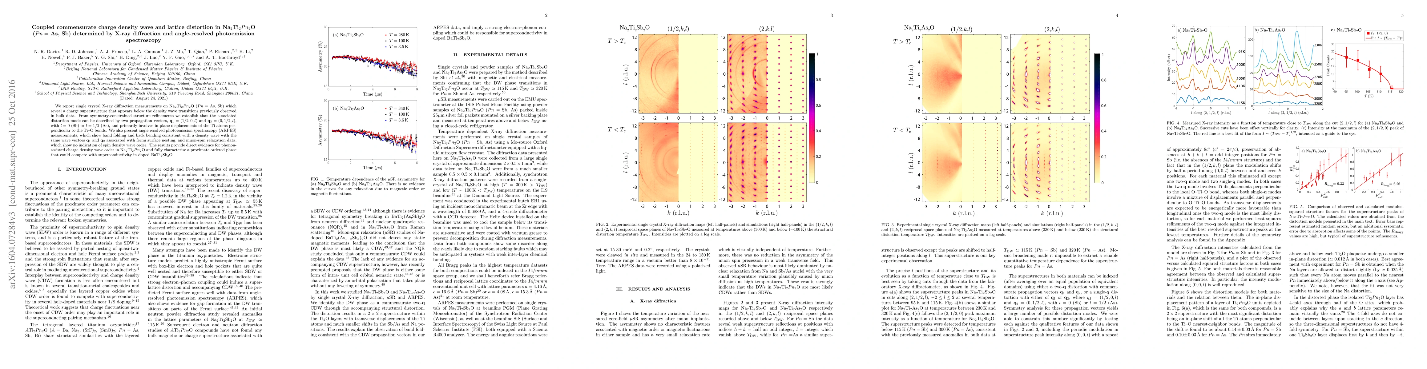 This paper reports on X-ray diffraction studies of Na$_2$Ti$_{2}Pn_{2}$O ($Pn$ = As, Sb), revealing a charge superstructure linked to lattice distortions below density wave transitions. The distortion involves in-plane Ti atom displacements, providing evidence for phonon-assisted charge density wave order and suggesting a potential competition with superconductivity in doped BaTi$_{2}$Sb$_{2}$O.
