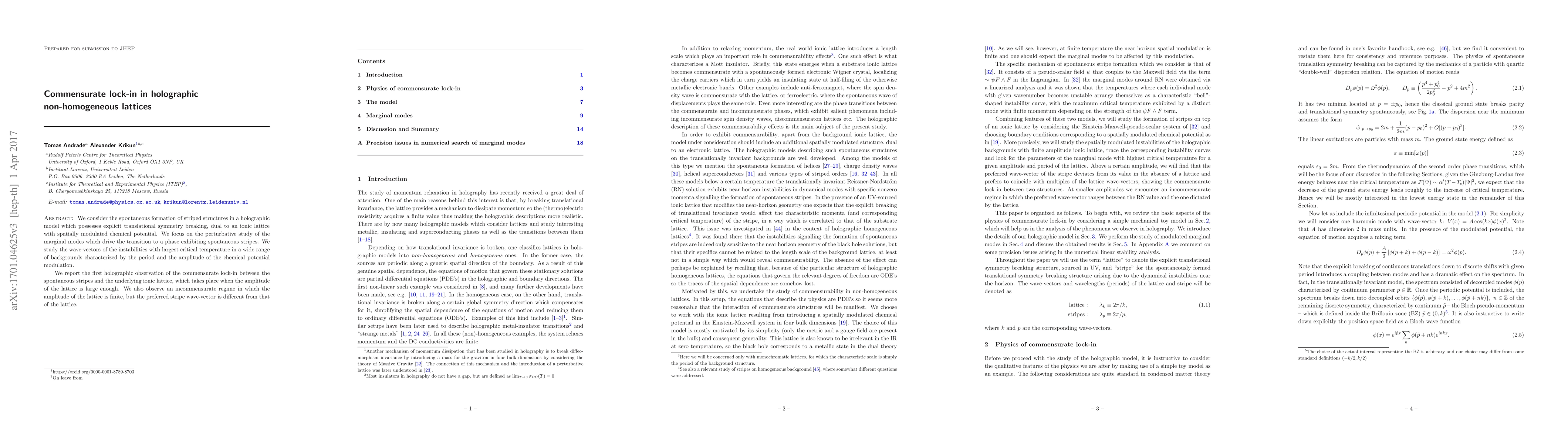 We consider the spontaneous formation of striped structures in a holographic model which possesses explicit translational symmetry breaking, dual to an ionic lattice with spatially modulated chemical potential. We focus on the perturbative study of the marginal modes which drive the transition to a phase exhibiting spontaneous stripes. We study the wave-vectors of the instabilities with largest critical temperature in a wide range of backgrounds characterized by the period and the amplitude of the chemical potential modulation. We report the first holographic observation of the commensurate lock-in between the spontaneous stripes and the underlying ionic lattice, which takes place when the amplitude of the lattice is large enough. We also observe an incommensurate regime in which the amplitude of the lattice is finite, but the preferred stripe wave-vector is different from that of the lattice.