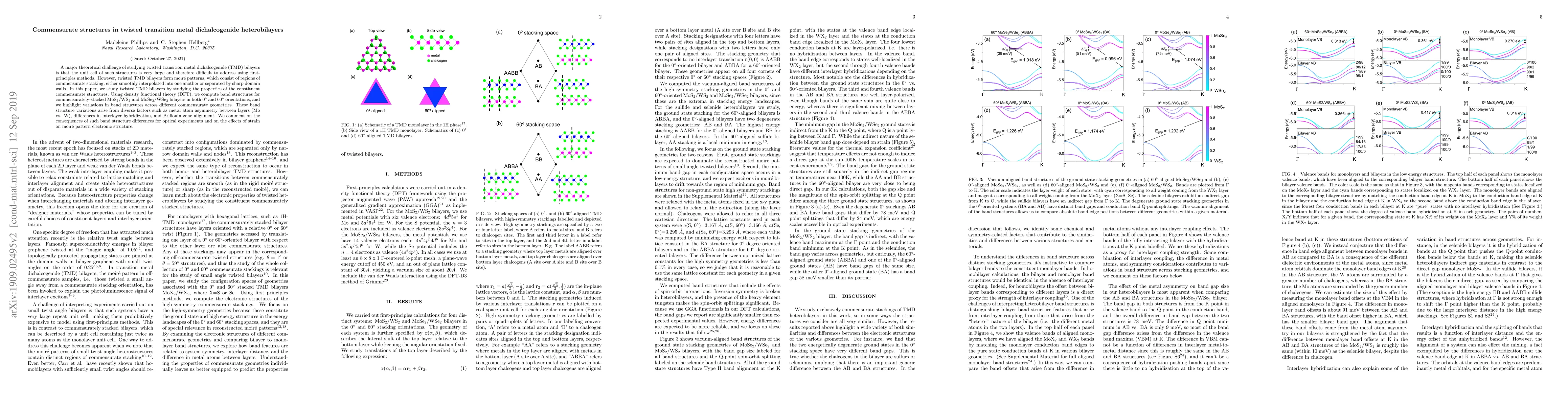A major theoretical challenge of studying twisted transition metal dichalcogenide (TMD) bilayers is that the unit cell of such structures is very large and therefore difficult to address using first-principles methods. However, twisted TMD bilayers form moir\'e patterns, which consist of regions of commensurate stacking, either smoothly interpolated into one another or separated by sharp domain walls. In this paper, we study twisted TMD bilayers by studying the properties of the constituent commensurate structures. Using density functional theory (DFT), we compute band structures for commensurately-stacked MoS$_2$/WS$_2$ and MoSe$_2$/WSe$_2$ bilayers in both $0^\circ$ and $60^\circ$ orientations, and we highlight variations in band structures across different commensurate geometries. These band structure variations arise from diverse factors such as metal atom asymmetry between layers (Mo vs. W), differences in interlayer hybridization, and Brillouin zone alignment. We comment on the consequences of such band structure differences for optical experiments and on the effects of strain on moir\'e pattern electronic structure.