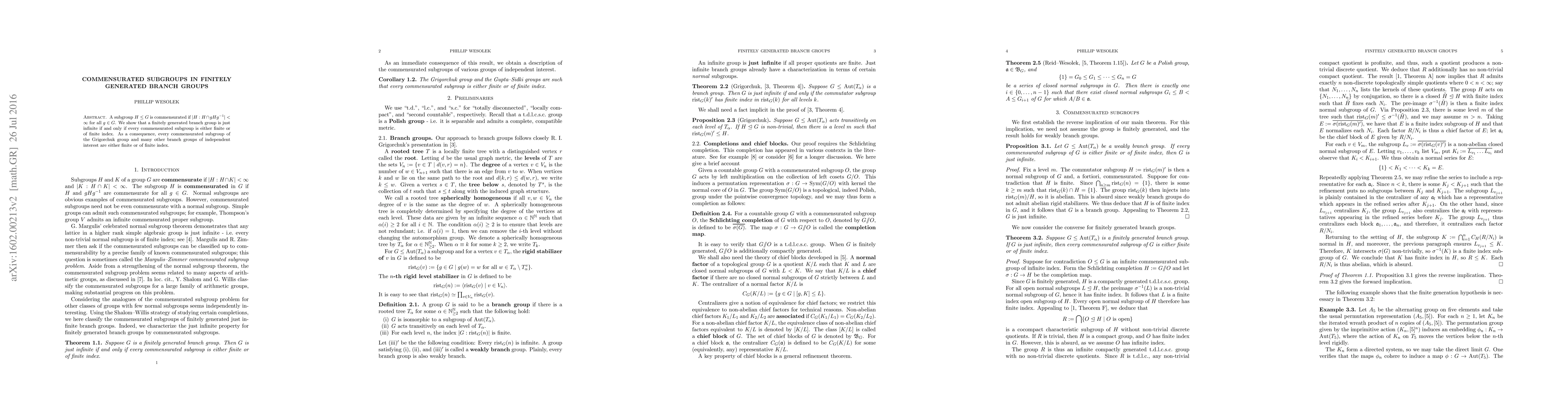 This paper demonstrates that a finitely generated branch group is just infinite if and only if every commensurated subgroup is either finite or of finite index, with a specific application to the Grigorchuk group.