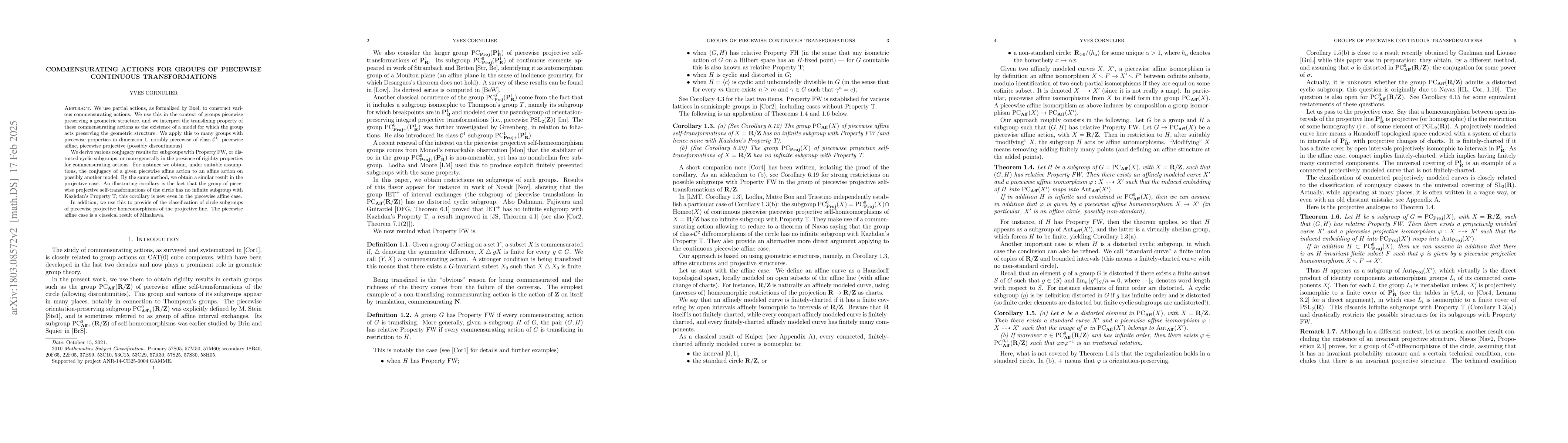 We use partial actions, as formalized by Exel, to construct various commensurating actions. We use this in the context of groups piecewise preserving a geometric structure, and we interpret the transfixing property of these commensurating actions as the existence of a model for which the group acts preserving the geometric structure. We apply this to many groups with piecewise properties in dimension 1, notably piecewise of class C^k, piecewise affine, piecewise projective (possibly discontinuous). We derive various conjugacy results for subgroups with Property FW, or distorted cyclic subgroups, or more generally in the presence of rigidity properties for commensurating actions. For instance we obtain, under suitable assumptions, the conjugacy of a given piecewise affine action to an affine action on possibly another model. By the same method, we obtain a similar result in the projective case. An illustrating corollary is the fact that the group of piecewise projective self-transformations of the circle has no infinite subgroup with Kazhdan's Property T; this corollary is new even in the piecewise affine case. In addition, we use this to provide of the classification of circle subgroups of piecewise projective homeomorphisms of the projective line. The piecewise affine case is a classical result of Minakawa.