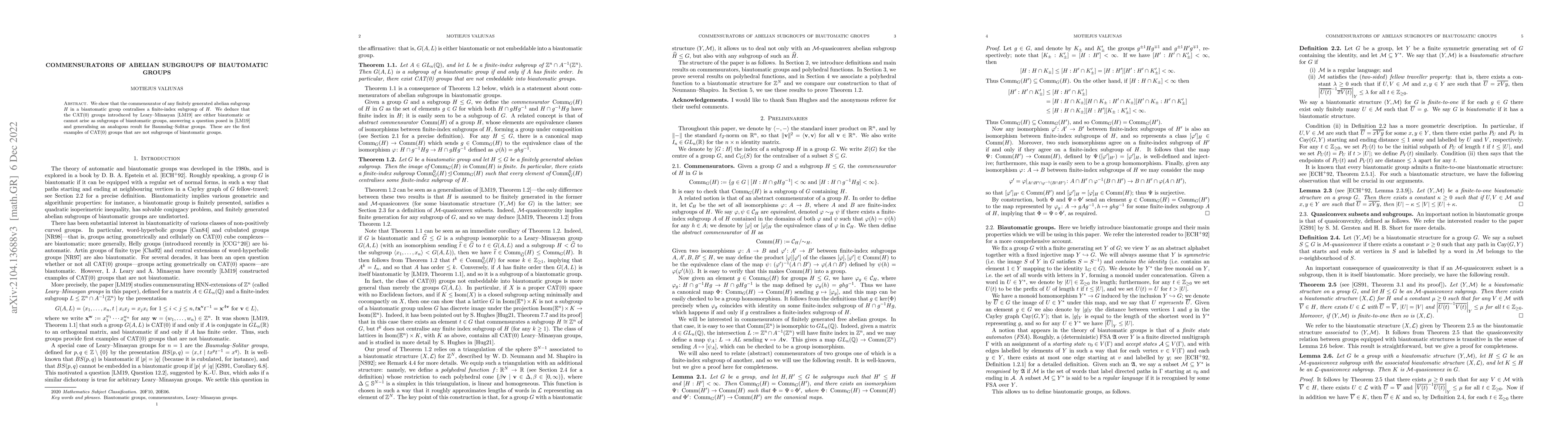 Summary: The paper demonstrates that the commensurator of any finitely generated abelian subgroup in a biautomatic group centralizes a subgroup of finite index within it. This finding resolves a question about the nature of specific CAT(0) groups, showing they are either biautomatic or cannot be subgroups of biautomatic groups.