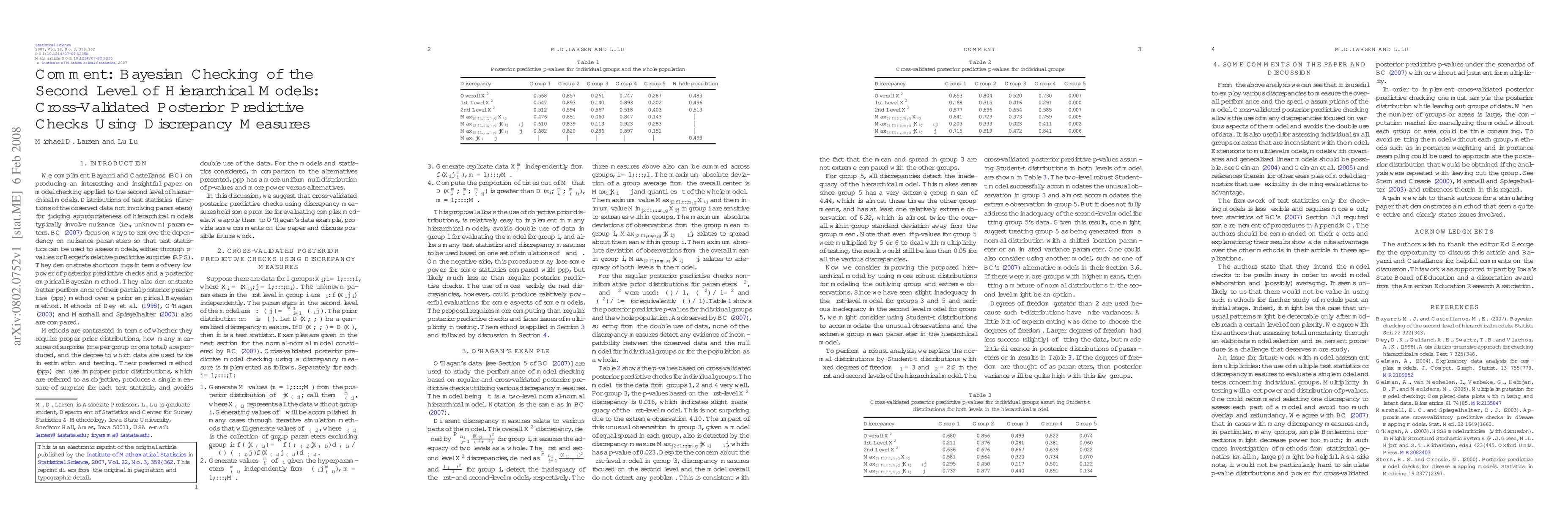 This paper proposes a method for Bayesian checking of the second level in hierarchical models using cross-validated posterior predictive checks and discrepancy measures. The approach aims to improve model validation by assessing the fit of the model at the second level of the hierarchy.