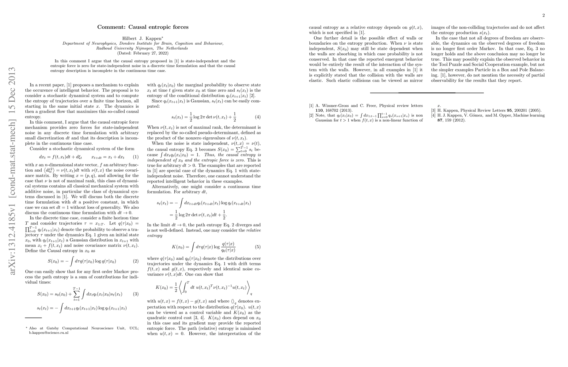 In this comment I argue that the causal entropy proposed in [1] is state-independent and the entropic force is zero for state-independent noise in a discrete time formulation and that the causal entropy description is incomplete in the continuous time case.