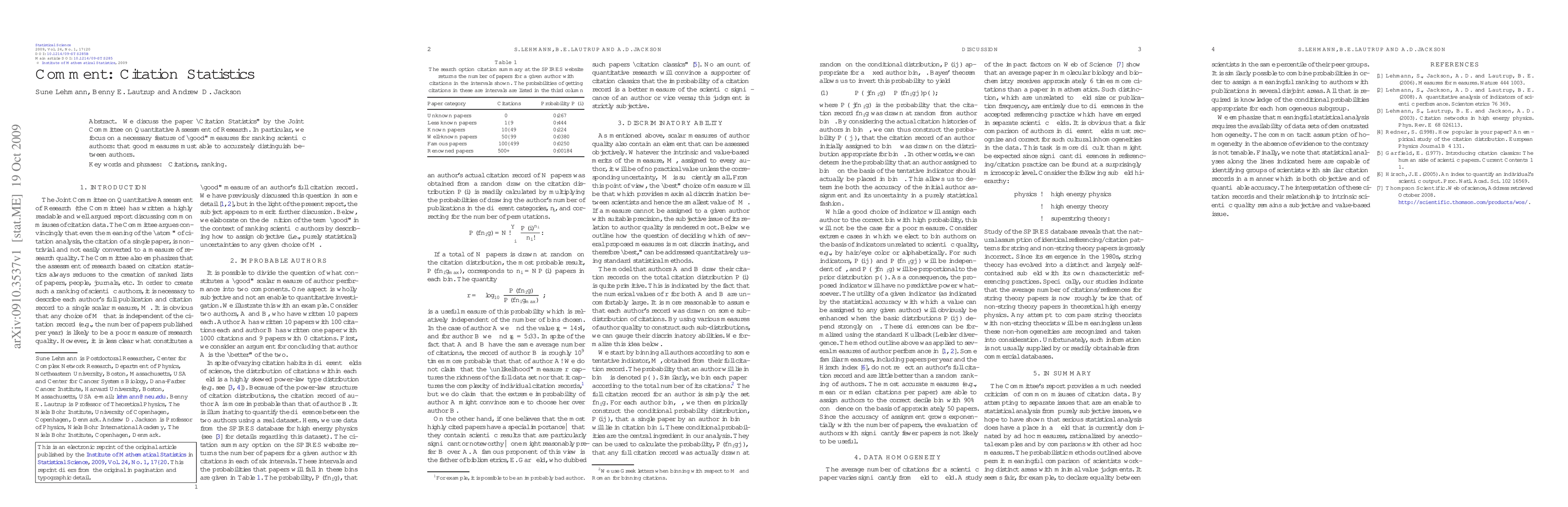 This paper by the Joint Committee on Quantitative Assessment of Research examines essential criteria for effective citation metrics used to rank scientific authors, emphasizing the importance of distinguishing accurately between different authors. [arXiv:0910.3529]