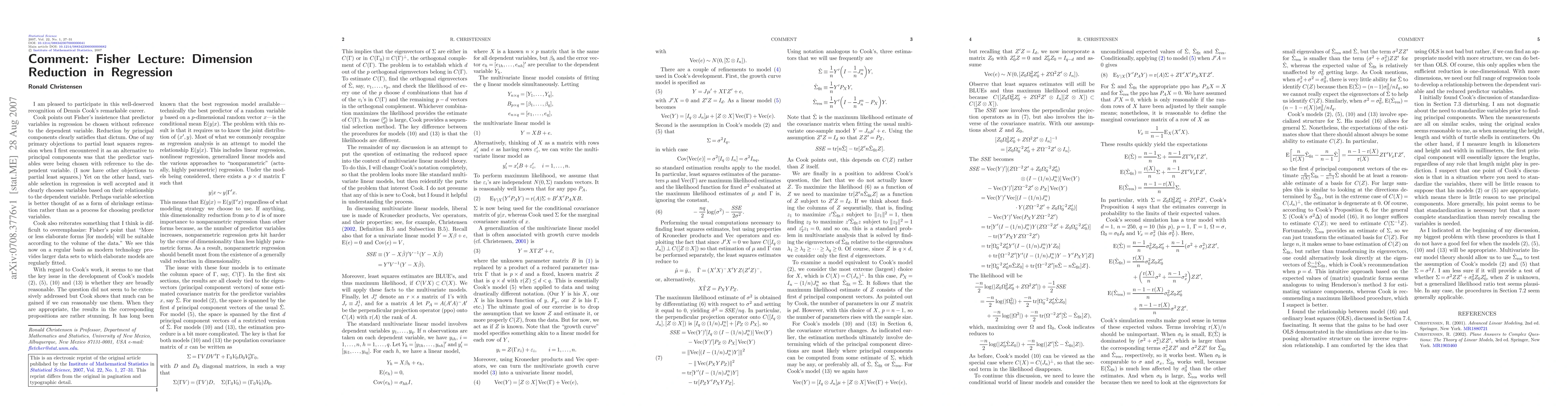 Comment: Fisher Lecture: Dimension Reduction in Regression [arXiv:0708.3774]