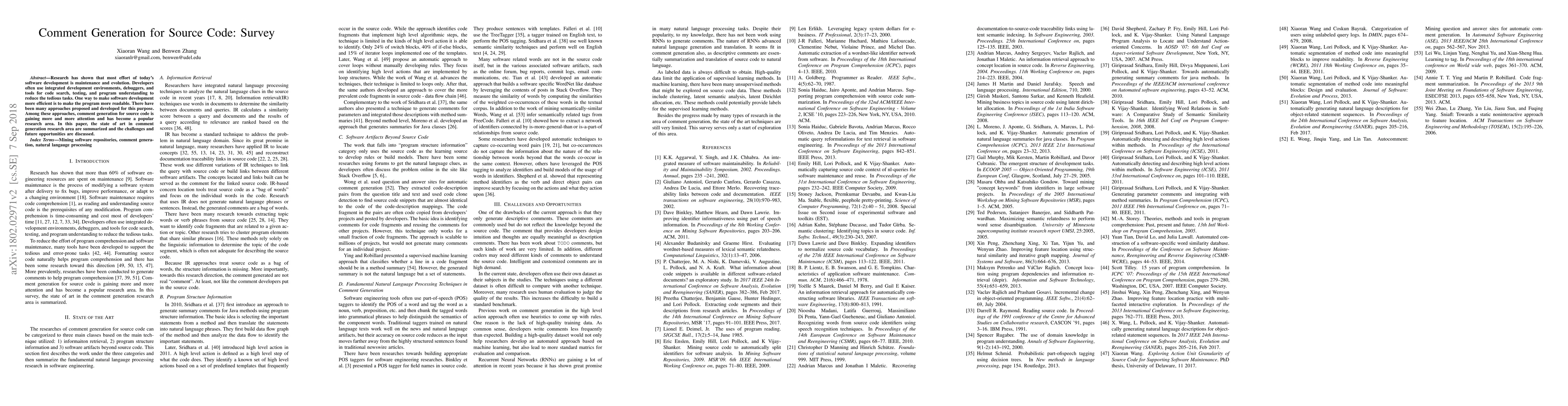 Researches have shown that most effort of today's software development is maintenance and evolution. Developers often use integrated development environments, debuggers, and tools for code search, testing, and program understanding to reduce the tedious tasks. One way to make software development more efficient is to make the program more readable. There have been many approaches proposed and developed for this purpose. Among these approaches, comment generation for source code is gaining more and more attention and has become a popular research area. In this paper, the state of art in comment generation research area are summarized and the challenges and future opportunities are discussed.