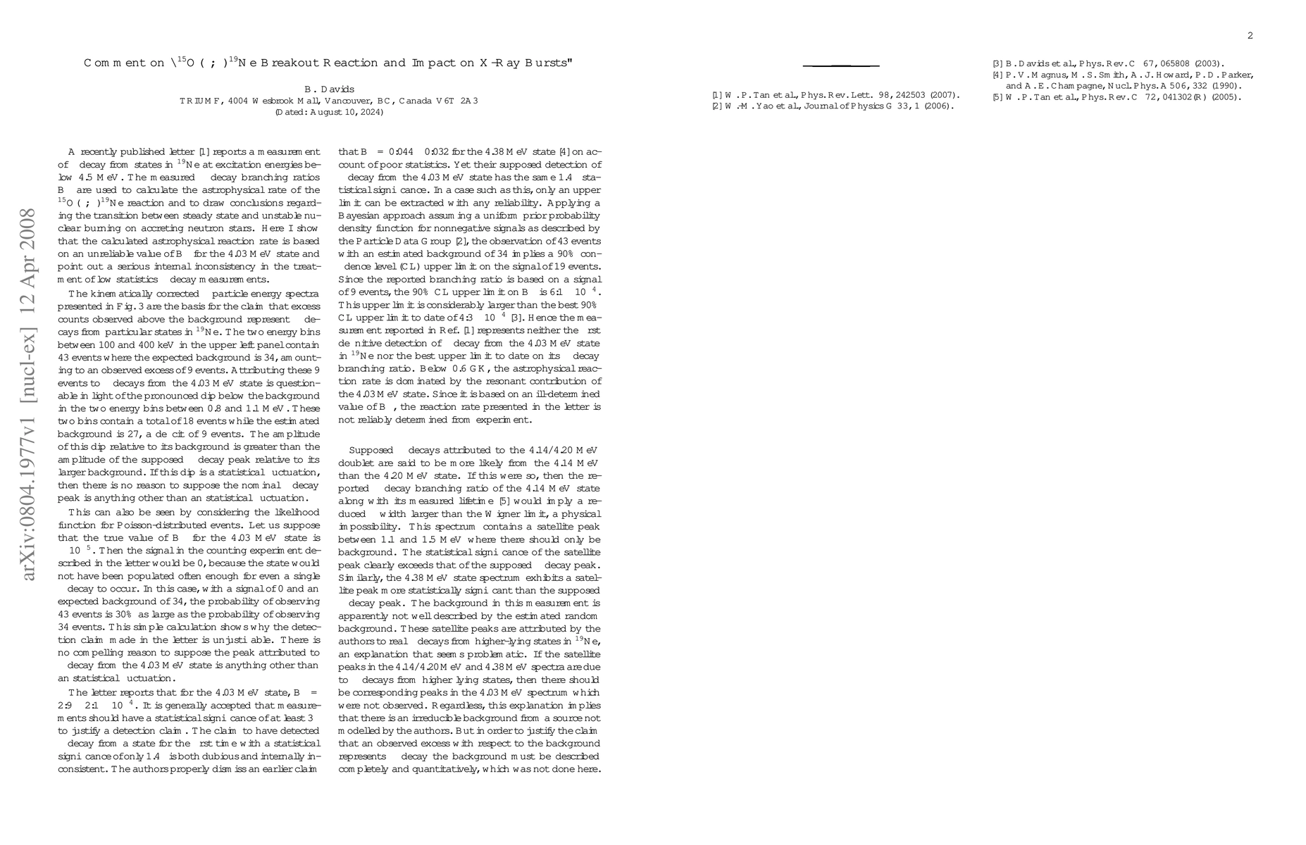 A recently published letter reports a measurement of alpha decay from states in 19Ne at excitation energies below 4.5 MeV. The measured alpha decay branching ratios B_alpha are used to calculate the astrophysical rate of the 15O(alpha,gamma)19Ne reaction and to draw conclusions regarding the transition between steady state and unstable nuclear burning on accreting neutron stars. Here I show that the calculated astrophysical reaction rate is based on an unreliable value of B_alpha for the 4.03 MeV state and point out a serious internal inconsistency in the letter's treatment of low statistics alpha decay measurements.