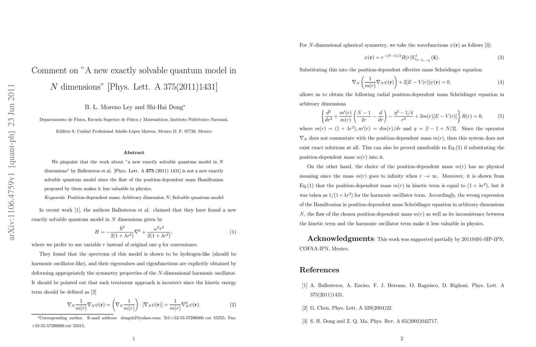 A research paper critiques a proposed quantum model in N dimensions as flawed due to its position-dependent mass Hamiltonian, rendering it less valuable for physics.