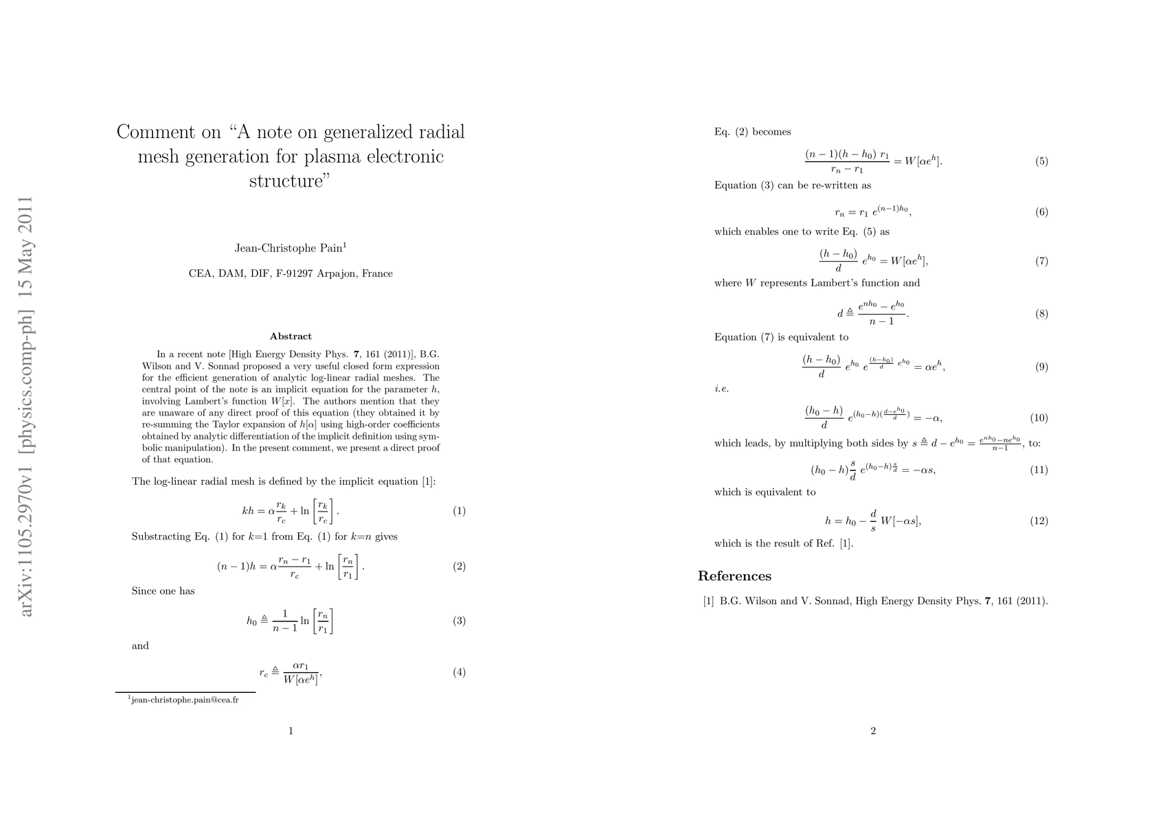 In a recent note [High Energy Density Phys. 7, 161 (2011)], B.G. Wilson and V. Sonnad proposed a very useful closed form expression for the efficient generation of analytic log-linear radial meshes. The central point of the note is an implicit equation for the parameter h, involving Lambert's function W[x]. The authors mention that they are unaware of any direct proof of this equation (they obtained it by re-summing the Taylor expansion of h using high-order coefficients obtained by analytic differentiation of the implicit definition using symbolic manipulation). In the present comment, we present a direct proof of that equation.