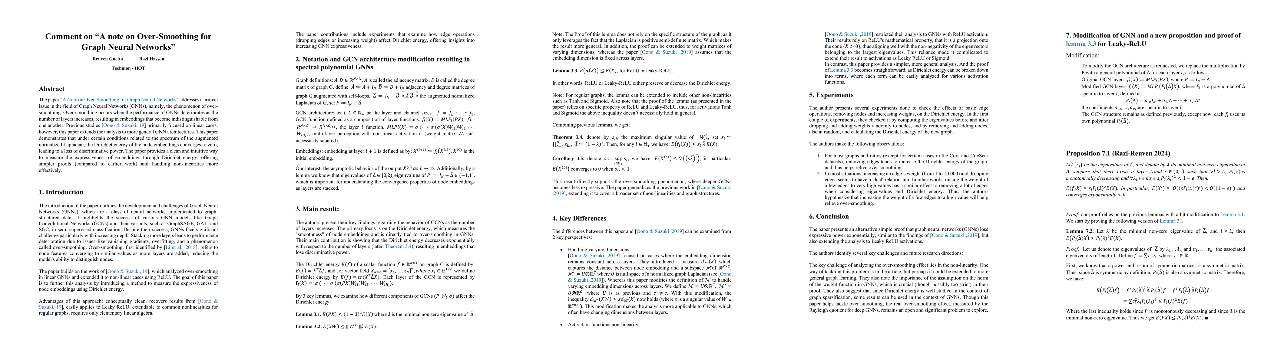 We comment on Cai and Wang (2020, arXiv:2006.13318), who analyze over-smoothing in GNNs via Dirichlet energy. We show that under mild spectral conditions (including with Leaky-ReLU), the Dirichlet energy of node embeddings decreases exponentially with depth; we further extend the result to spectral polynomial filters and provide a short proof for the Leaky-ReLU case. Experiments on edge deletion and weight amplification illustrate when Dirichlet energy increases, hinting at practical ways to relieve over-smoothing.