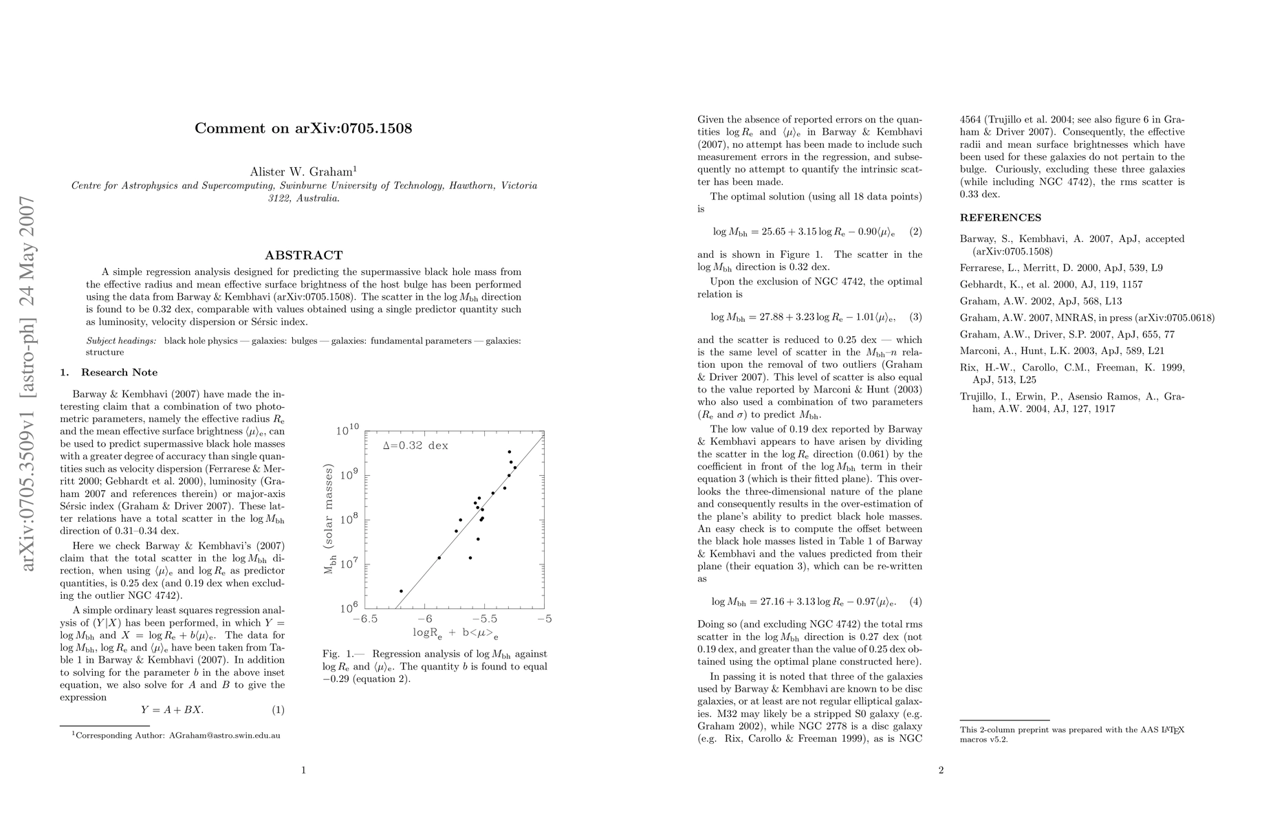 A simple regression analysis designed for predicting the supermassive black hole mass from the effective radius and mean effective surface brightness of the host bulge has been performed using the data from Barway & Kembhavi (arXiv:0705.1508). The scatter in the log M_bh direction is 0.32 dex, greater than reported and comparable with values obtained using a single predictor quantity such as luminosity, velocity dispersion or Sersic index.
