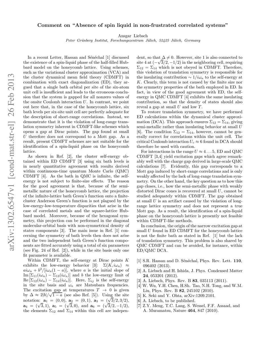 In a recent Letter, Hassan and S\'en\'echal [1] discussed the existence of a spin-liquid phase of the half-filled Hubbard model on the honeycomb lattice. Using schemes, such as the variational cluster approximation (VCA) and the cluster dynamical mean field theory (CDMFT) in combination with exact diagonalization (ED), they argued that a single bath orbital per site of the six-atom unit cell is insufficient and leads to the erroneous conclusion that the system is gapped for all nonzero values of the onsite Coulomb interaction $U$. In contrast, we point out here that, in the case of the honeycomb lattice, six bath levels per six-site unit cell are perfectly adequate for the description of short-range correlations. Instead, we demonstrate that it is the violation of long-range translation symmetry inherent in CDMFT-like schemes which opens a gap at Dirac points. The gap found at small $U$ therefore does not correspond to a Mott gap. As a result, present CDMFT schemes are not suitable for the identification of a spin-liquid phase on the honeycomb lattice. [1] S.R. Hassan and D. S\'en\'echal, Phys. Rev. Lett. 110, 096402 (2013).