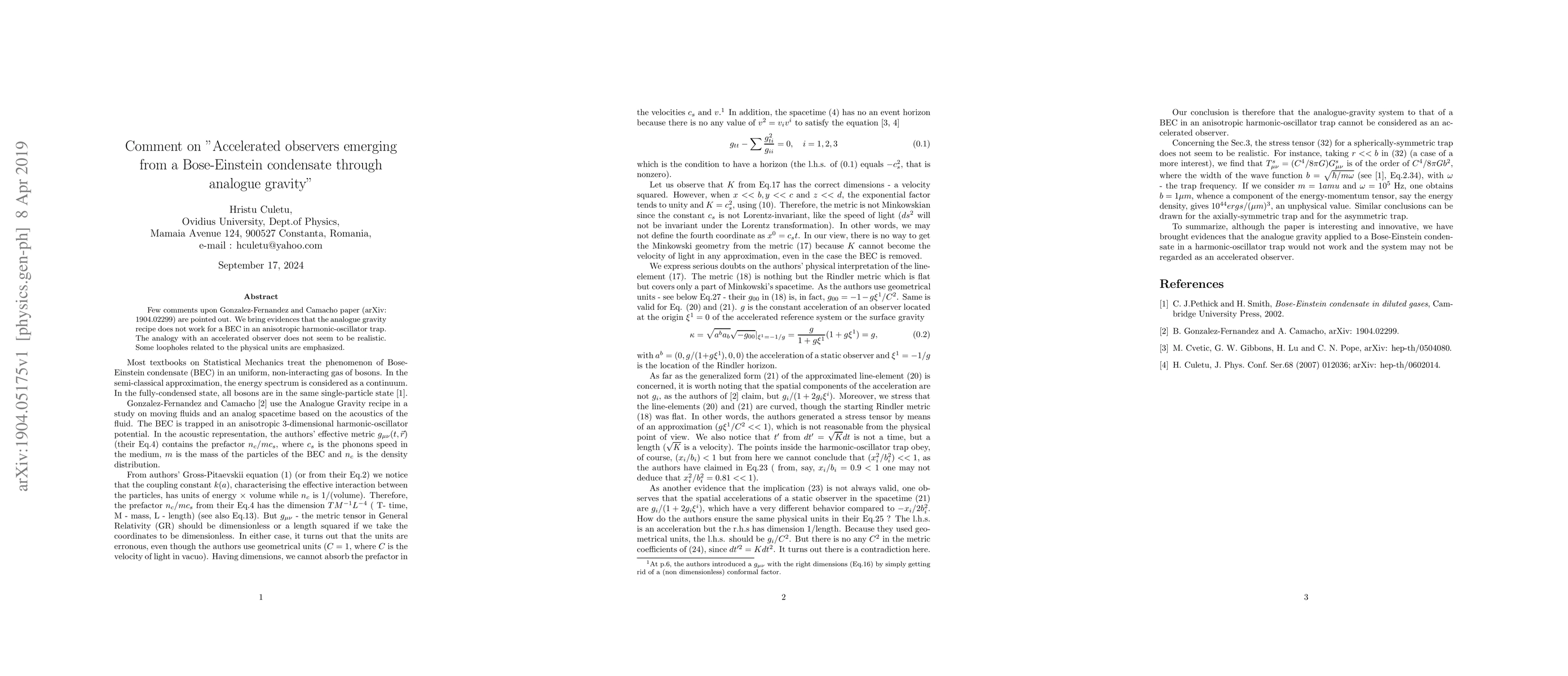 Few comments upon Gonzalez-Fernandez and Camacho paper (arXiv: 1904.02299) are pointed out. We bring evidences that the analogue gravity recipe does not work for a BEC in an anisotropic harmonic-oscillator trap. The analogy with an accelerated observer does not seem to be realistic. Some loopholes related to the physical units are emphasized.